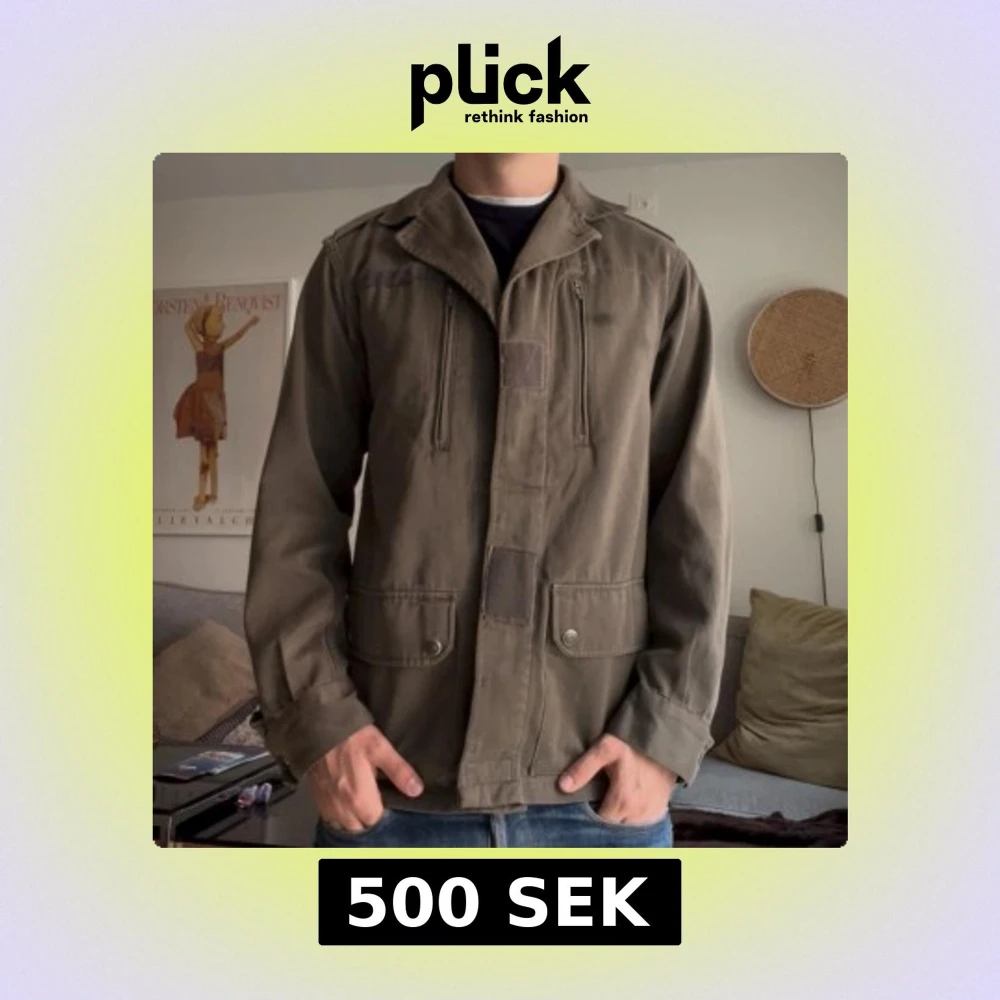 Säljer en grön militärjacka i bomull med coola detaljer som axelklaffar, två bröstfickor med dragkedja och stora fickor framtill. Jackan har klassisk krage och lång ärm, perfekt för dig som gillar en avslappnad och stilren look.