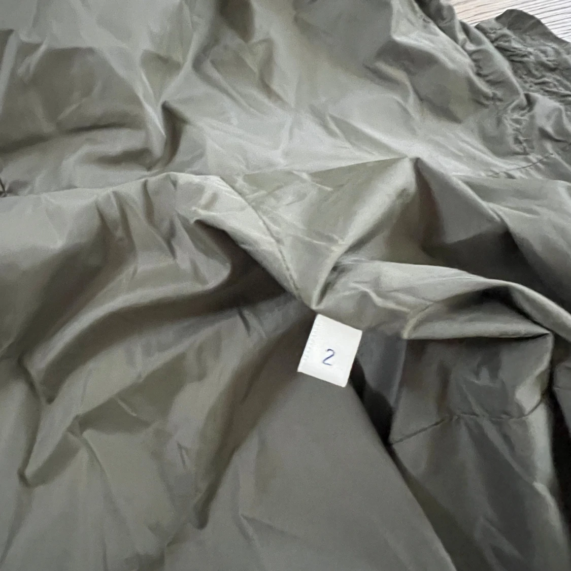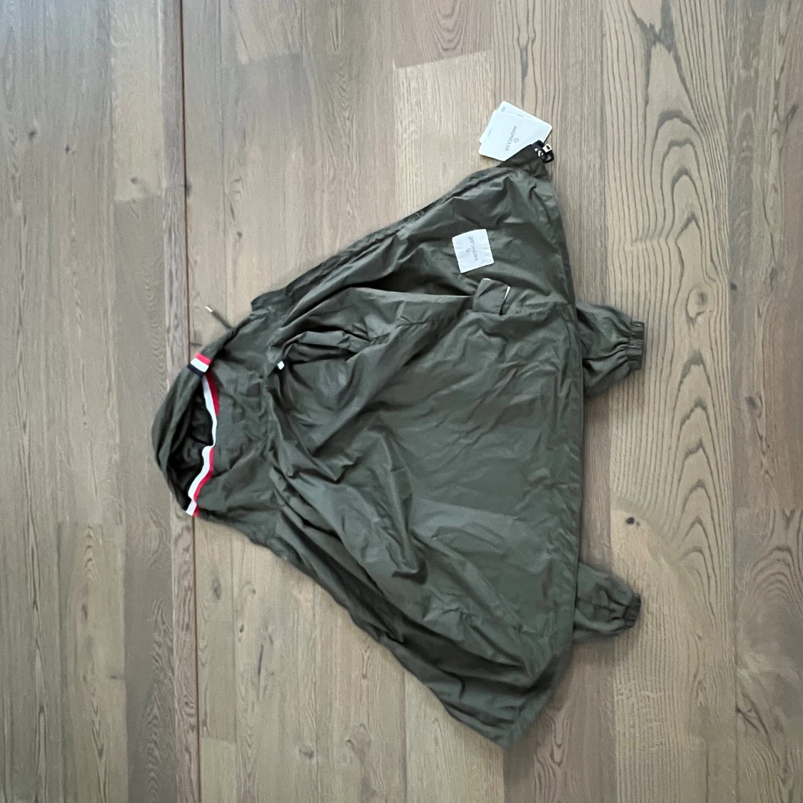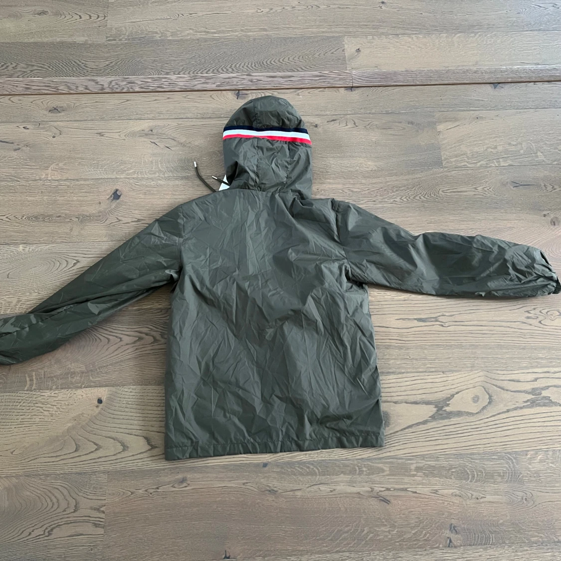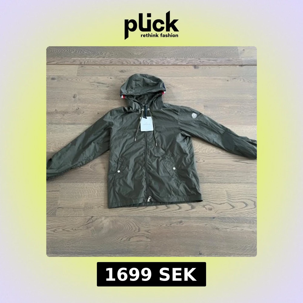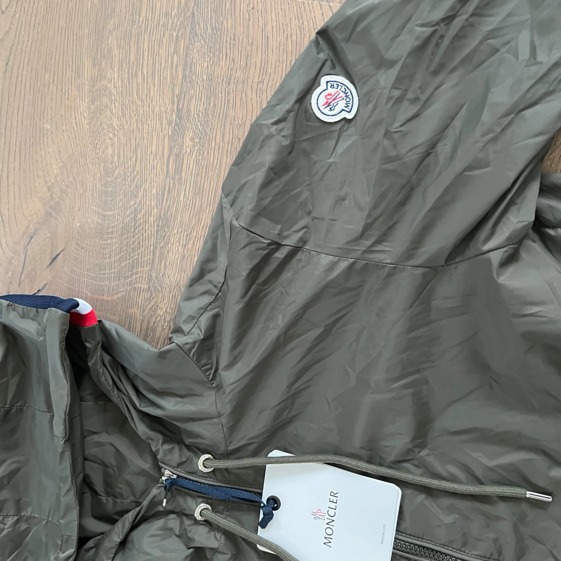 Snygg grön regnjacka från Moncler med huva och dragsko. Jackan har Moncler-logga på ärmen, två fickor med tryckknappar och dragkedja framtill. Huvan har en cool detalj med röd, vit och blå rand. Perfekt för blåsiga dagar och streetstyle. Väldigt passande nu till hösten, pris kan diskuteras vid snabbaffär