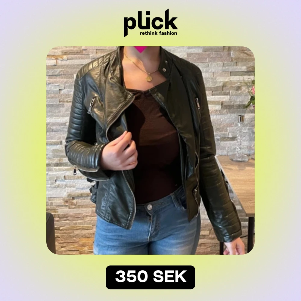 En olivgrön skinnjacka i fint skick! Ger vintage vibes och passar så bra nu när det är mode med skinnjackor! Jackan har en fin passform i storlek S