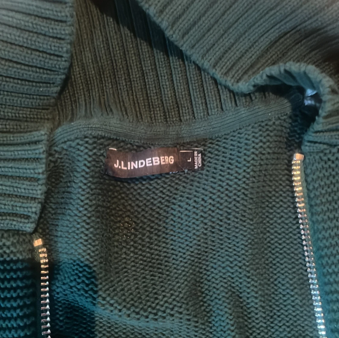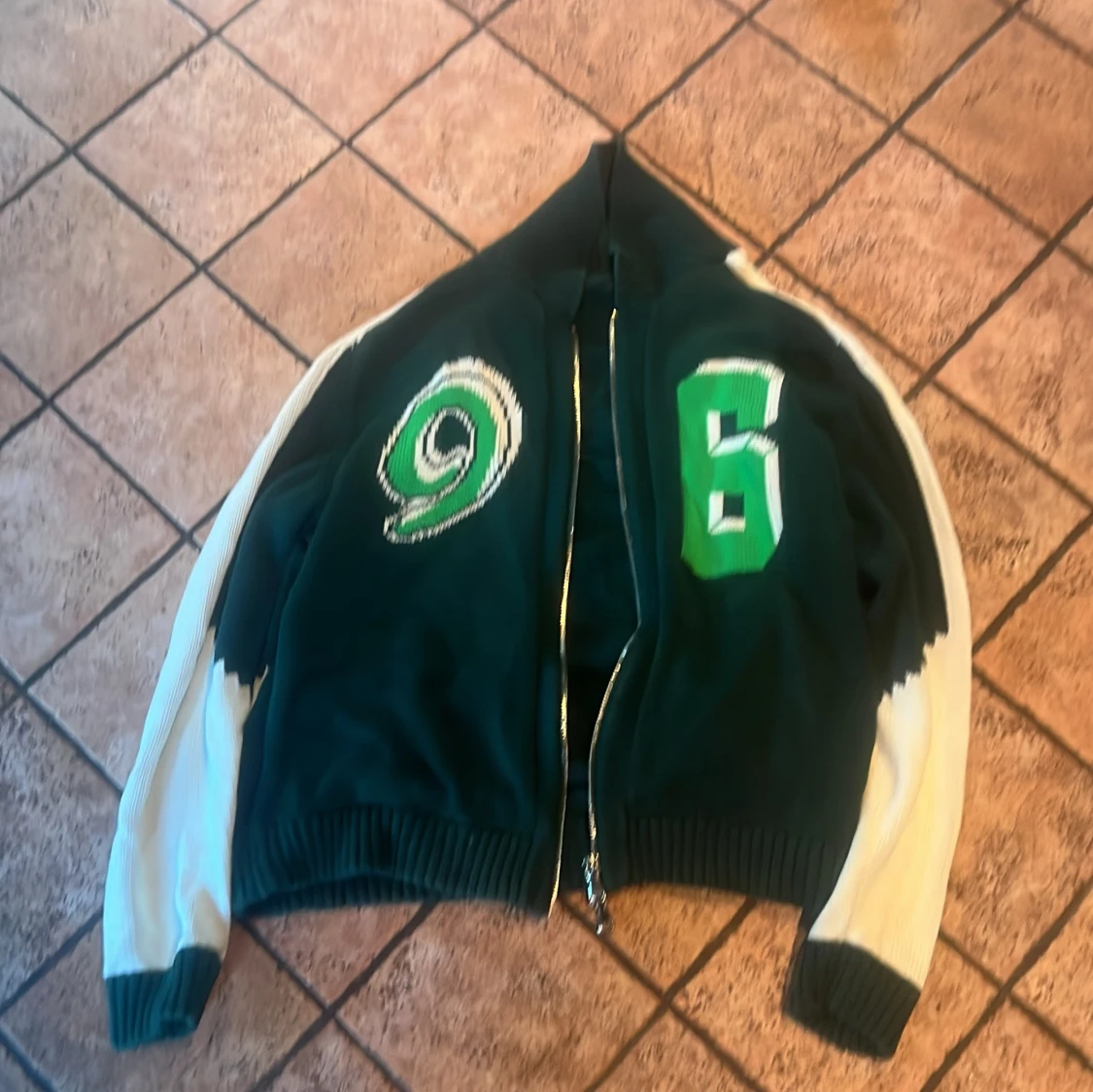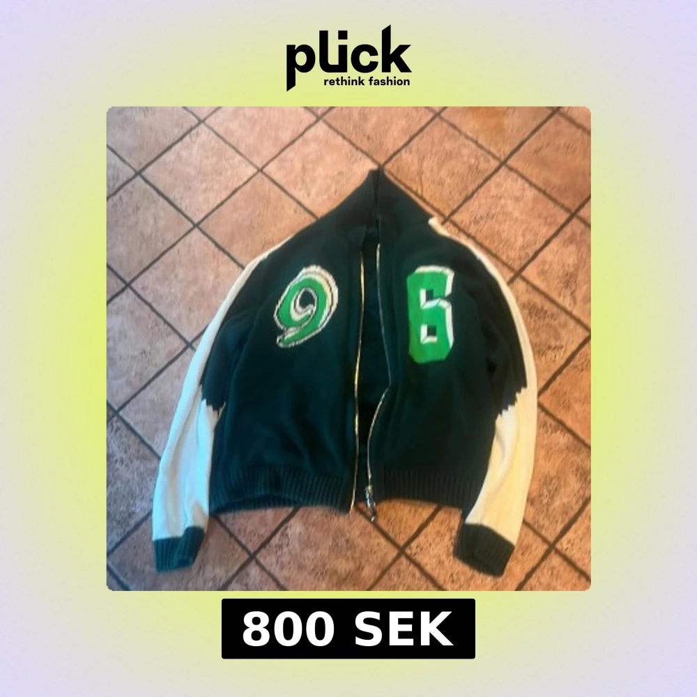 Säljer en grön stickad bomberjacka från J.Lindeberg med vita ärmar och coola broderade siffror på framsidan. Jackan har ribbade muddar, dragkedja och en schysst loose passform. Perfekt för dig som vill sticka ut med sportig stil och snygga detaljer.