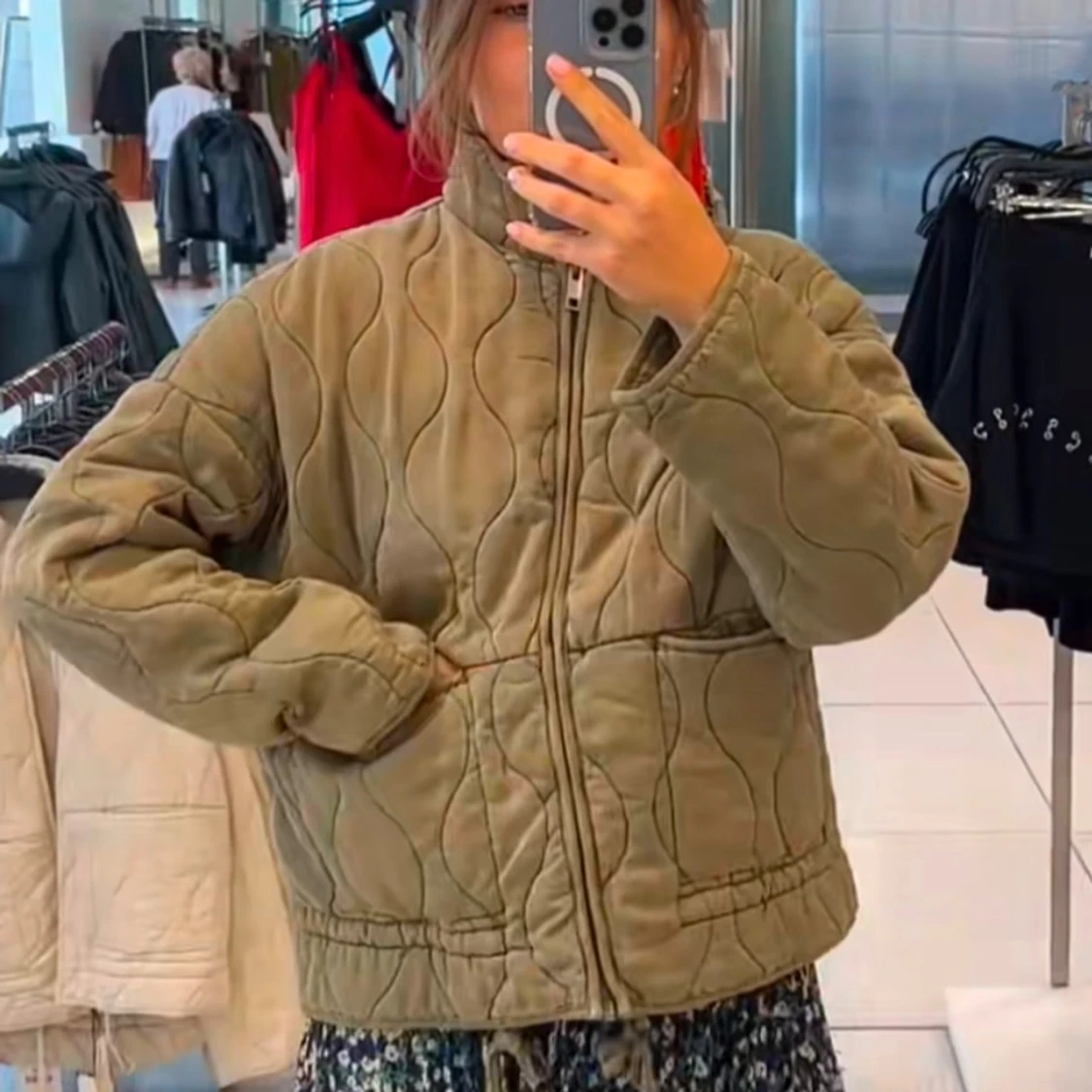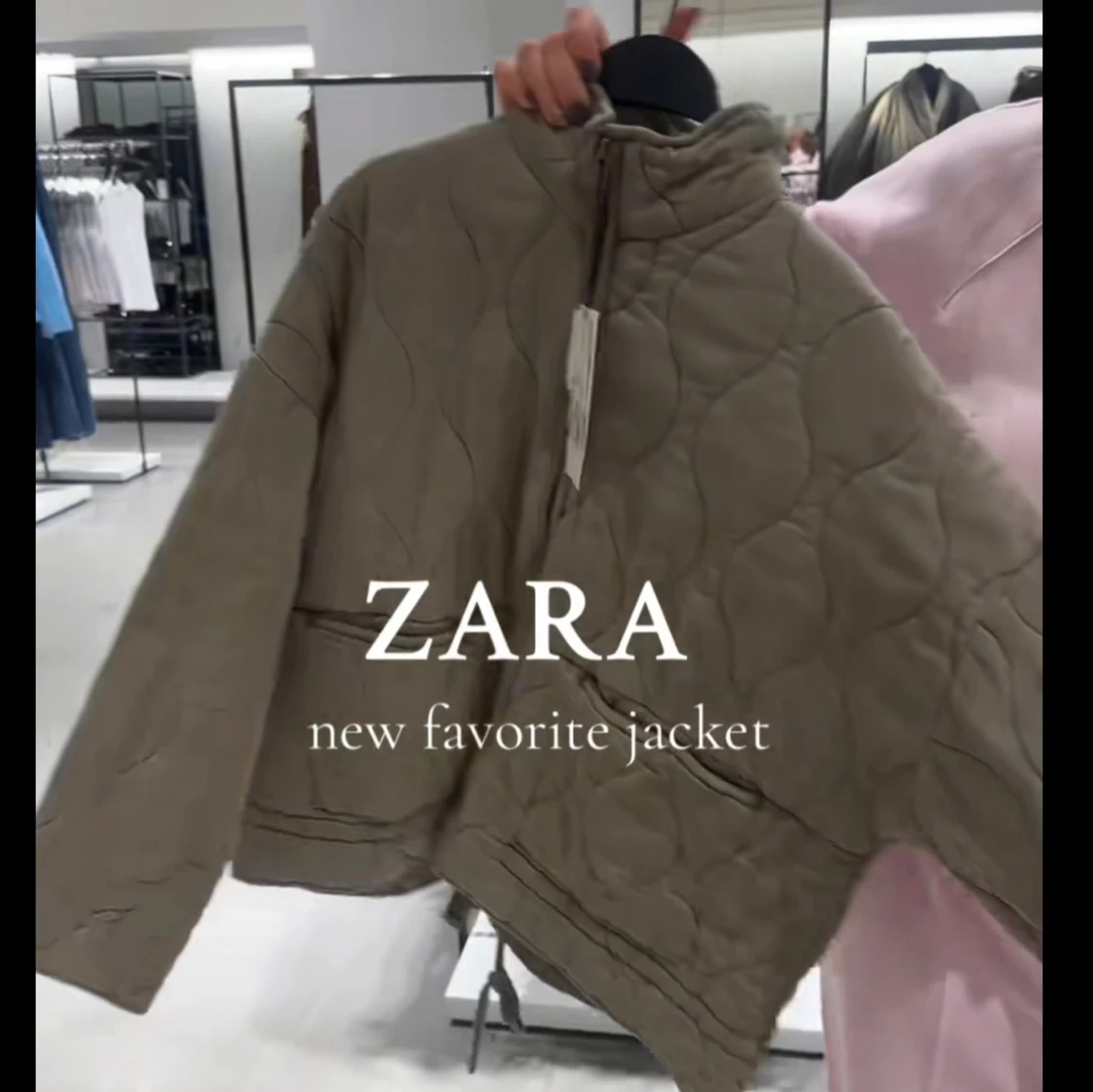Säljer en quiltad grön jacka från Zara med dragkedja framtill och snörning i midjan. Jackan har en loose passform, hög krage och två fickor. Perfekt för dig som gillar en avslappnad och trendig stil.