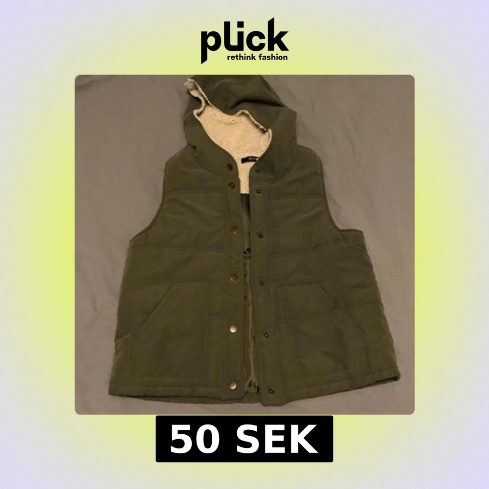 Grön väst med huva. Lurvigt tyg på insidan, matt på utsidan. Stängs med tryckknappar. Rak passform