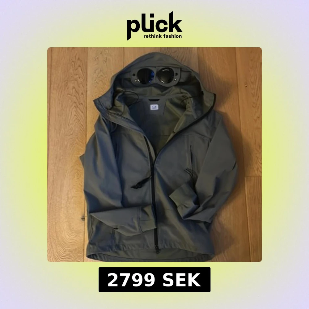 Säljer en grön vindjacka från C.P. Company med huva och värsting glasögon. Jackan har dragkedja framtill och är tillverkad i ett stretchigt soft shell-material av återvunnen nylon. Perfekt för en stilren look.