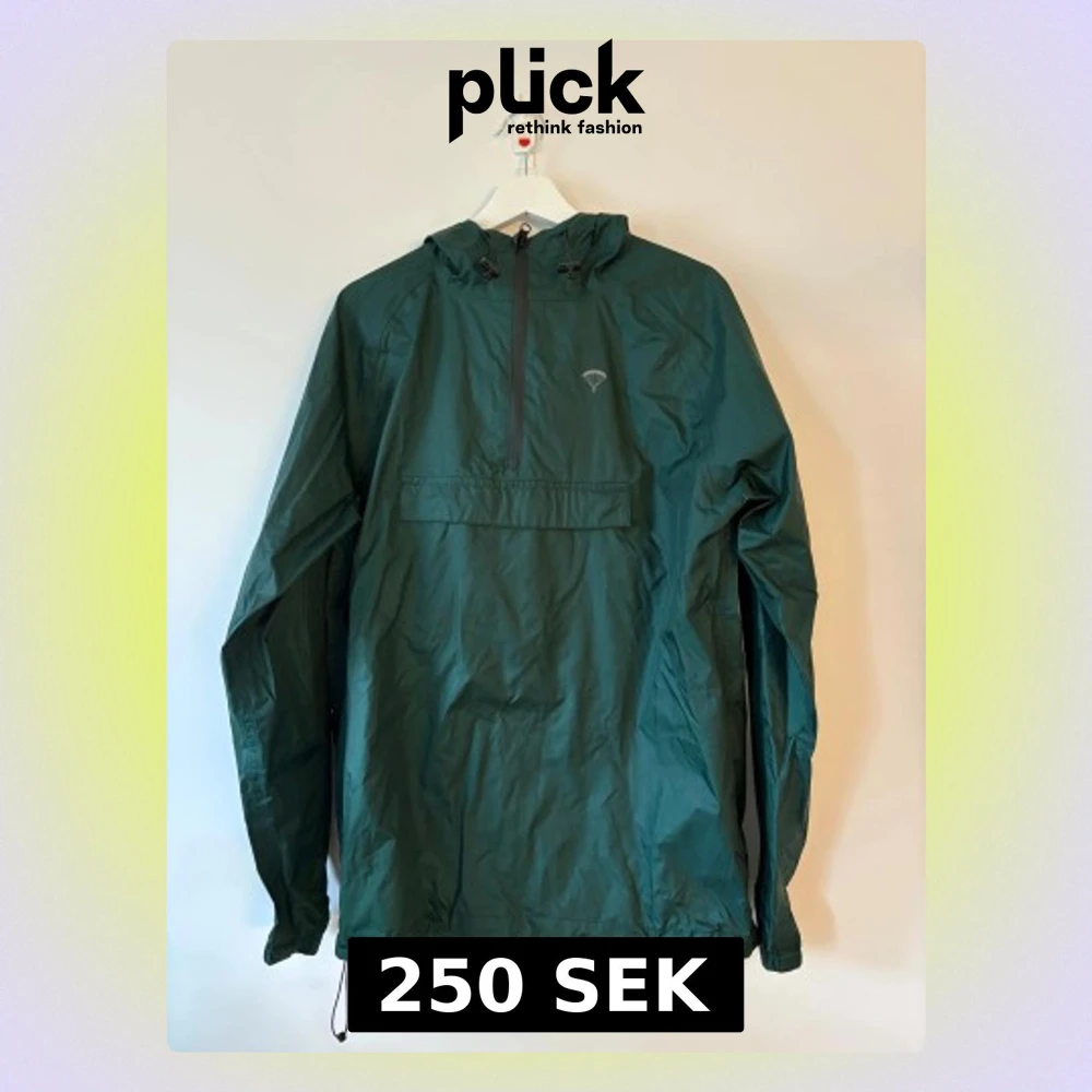 Mörkgrön vindjacka från Packmack i storlek M. Jackan har huva, half zip-dragkedja framtill och en stor ficka med dragkedja på magen. Tillverkad i 100% nylon, perfekt för blåsiga dagar. Snygg minimalistisk design med logga på bröstet.
