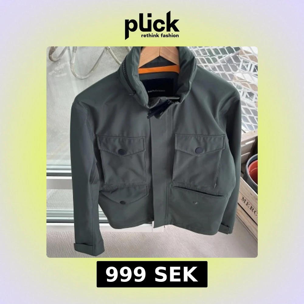 Snygg mörkgrön vindjacka från Peak Performance med fyra stora fickor framtill och diskret logga på ärmen. Jackan har hög krage med dragkedja och luva som går att gömma.