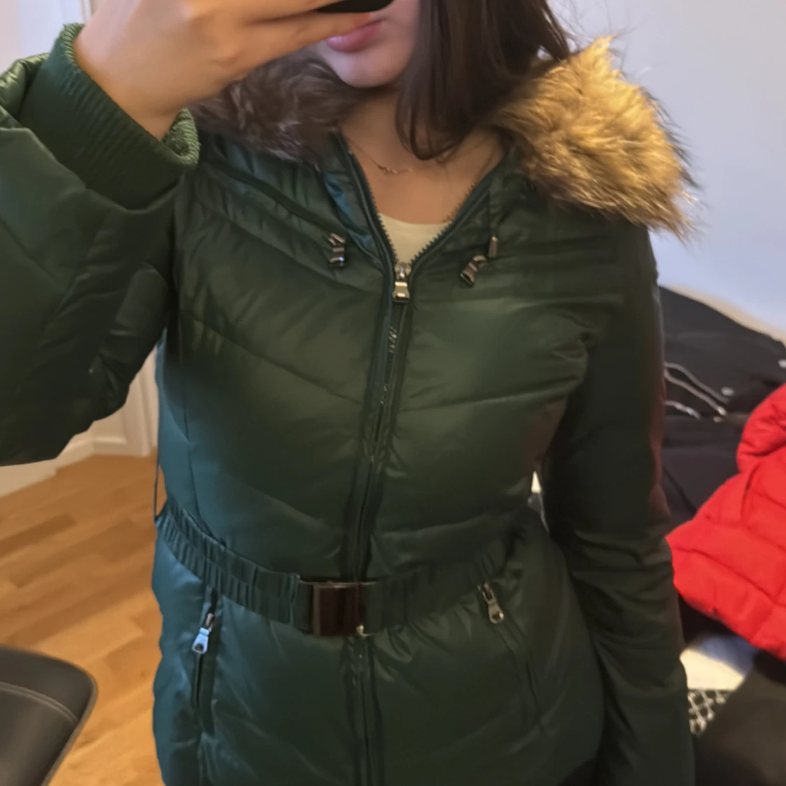 En snygg, lyxig och unik grön jacka med äkta päls på huvan. Jackan har dragkedja och ett bälte (avtagbar) i midjan för en figurnära passform. Perfekt för kyliga dagar.
