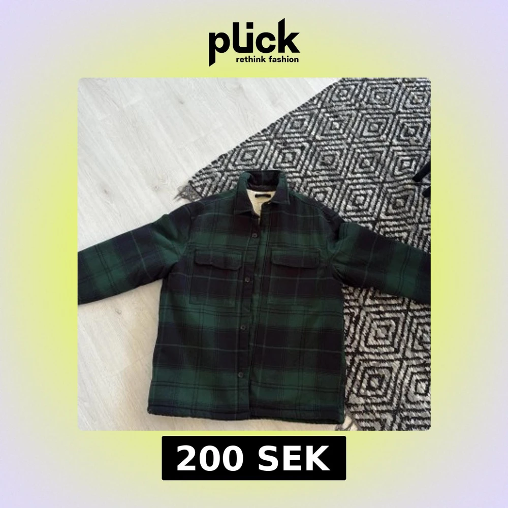 Snygg overshirt i mörkgrönt och svart rutigt mönster med mjukt, ljust teddyfoder på insidan. Jackan har två bröstfickor med lock, knäppning framtill och klassisk krage. Perfekt för lager-på-lager och chill höst- eller vinterstil. Använd 1 gång.
