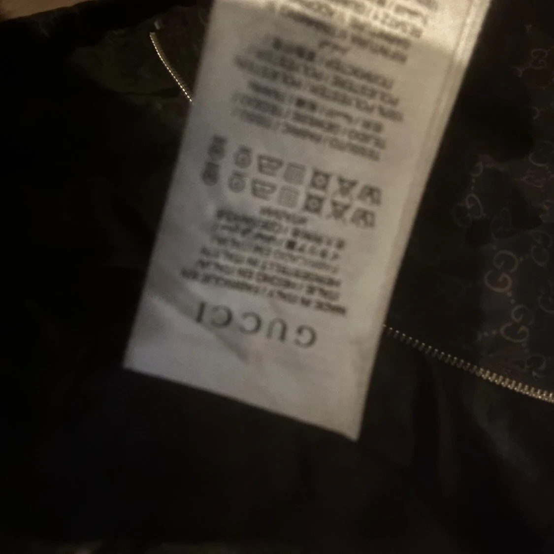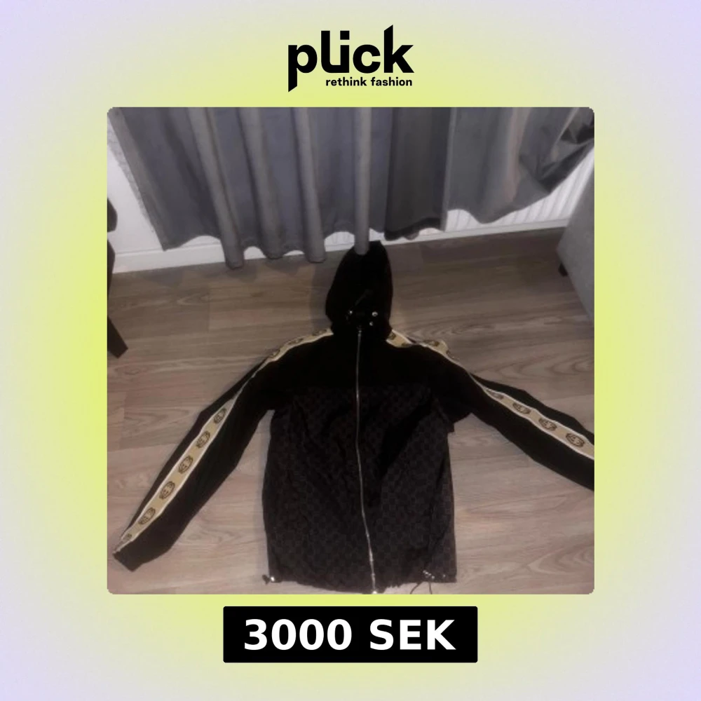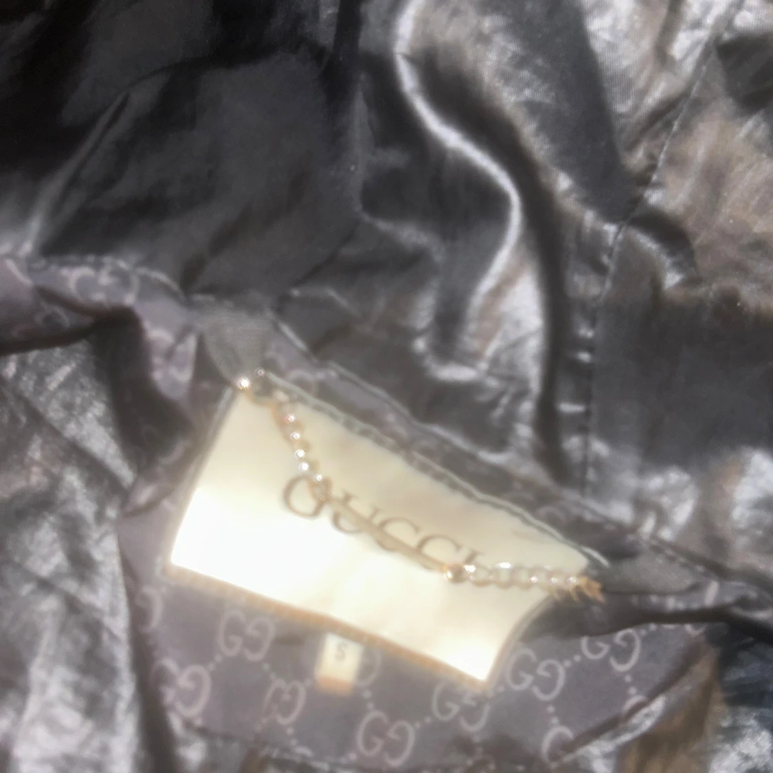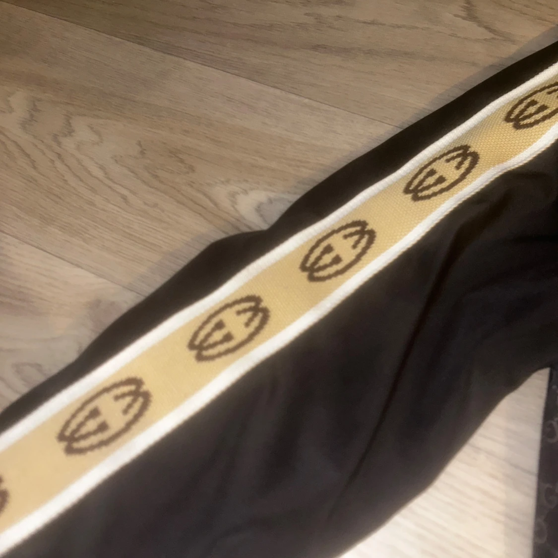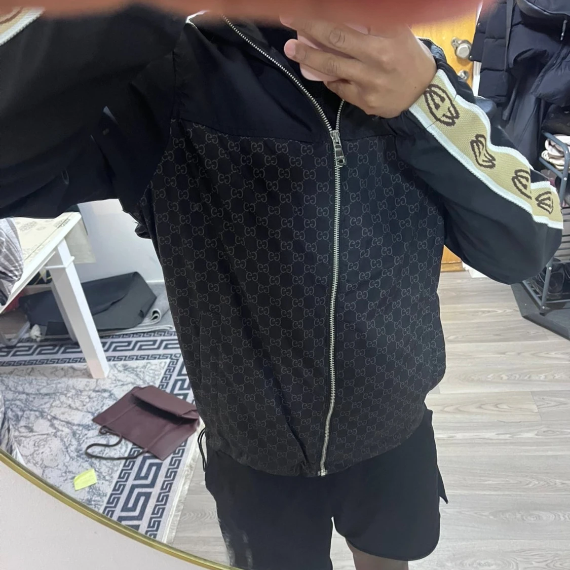 Gucci vindjacka i svart med beige och bruna GG-loggor längs ärmarna. Jackan har huva med snörning, hel dragkedja och diskret GG-mönster på framsidan. Materialet är polyester och jackan har en loose passform. Perfekt för dig som vill sticka ut med lyxig streetstyle.