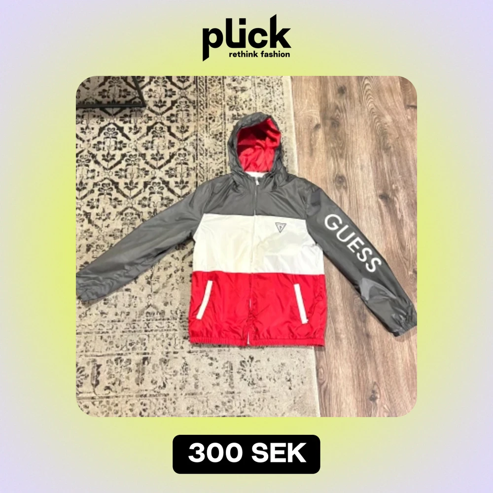 Säljer en snygg och stilren vindjacka från Guess i storlek M. Jackan har en cool färgblockdesign i svart, vit och röd med Guess-loggan tryckt på ärmen. Den har en dragkedja framtill och praktiska fickor. Perfekt för vår och höst!