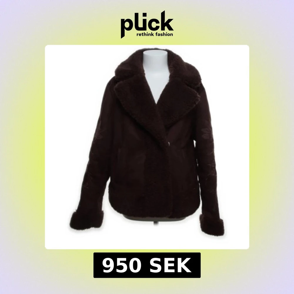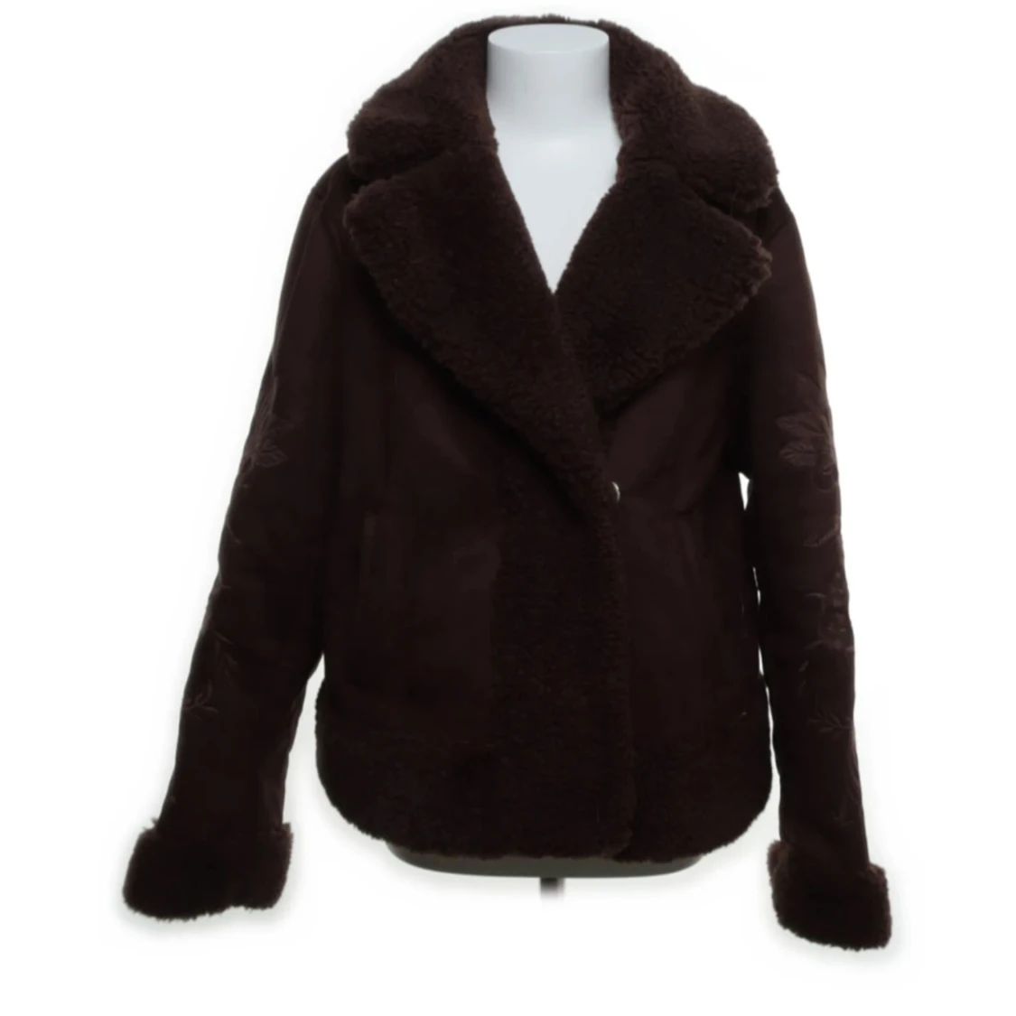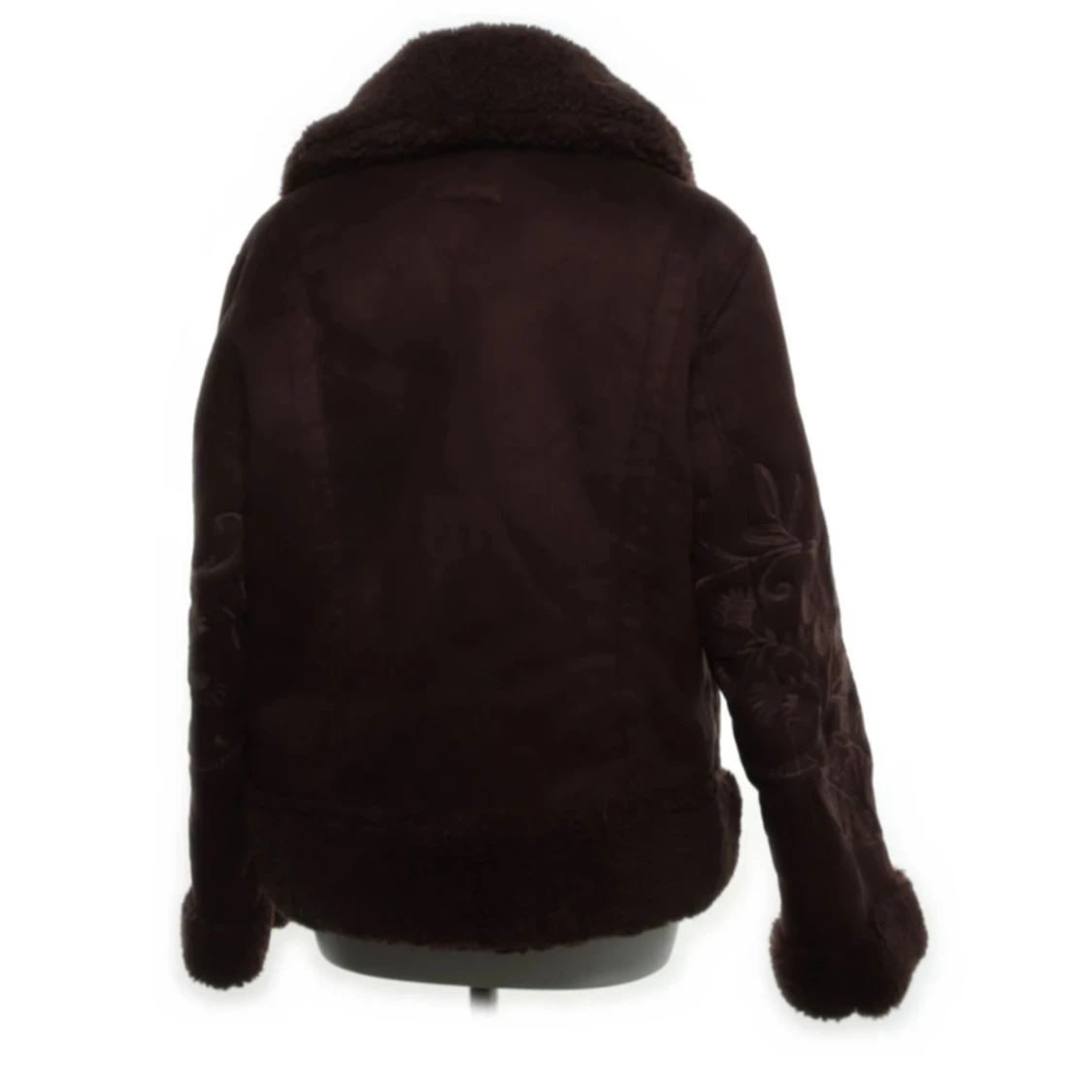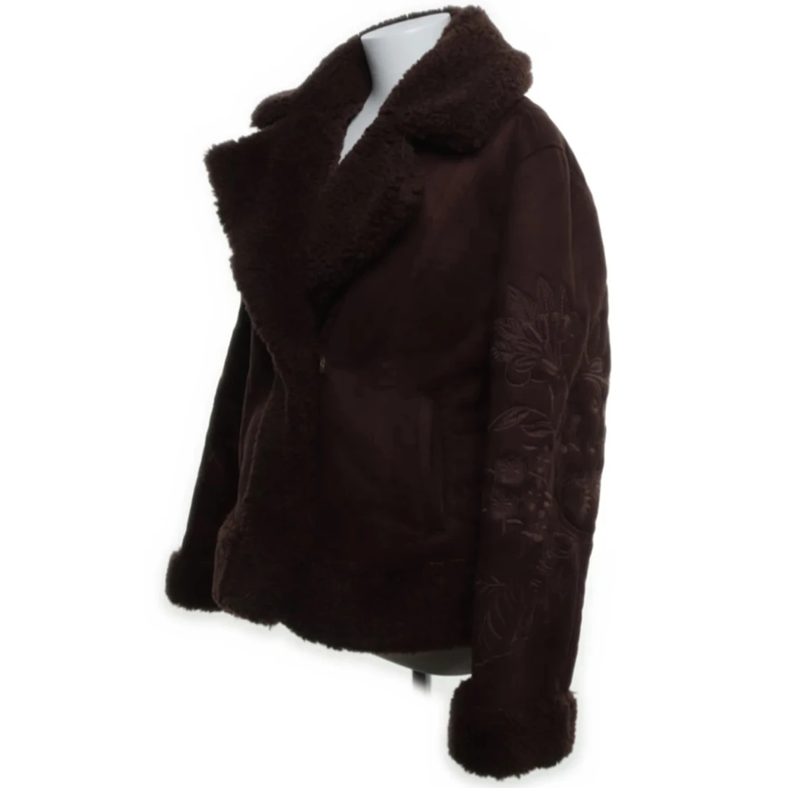 Snygg brun mockajacka med pälsdetaljer på krage och ärmslut. Jackan har ett broderat blommönster på ärmarna som ger en unik touch. Perfekt för kyliga dagar. den kommer inte till användning då den är för stor för mig. Har använt den några gånger men den är i mycket gott skick.