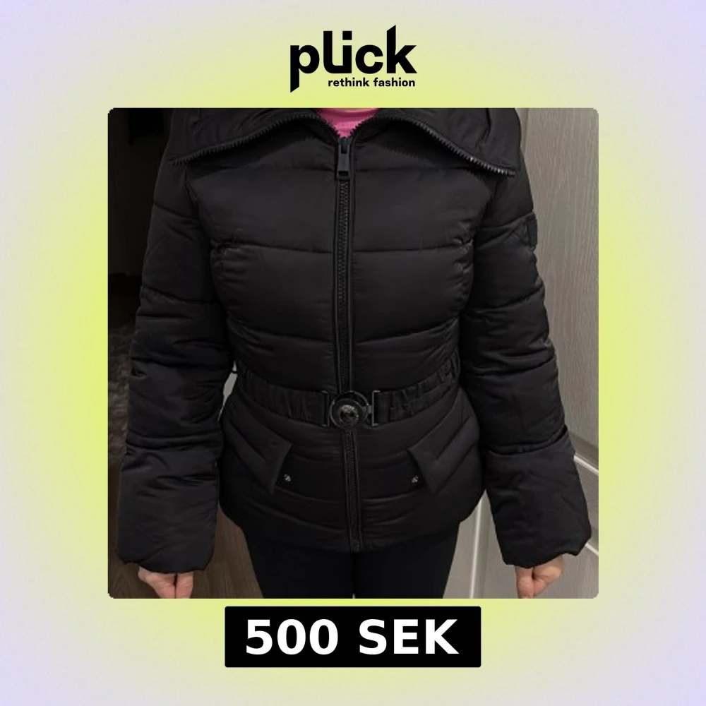 Svart pufferjacka från Guess med bred krage, markerad midja med snyggt bälte och dragkedja framtill. Jackan har långa ärmar och två fickor med lock. Materialet är polyester och jackan är fodrad, perfekt för kalla dagar. jackan är helt ny och aldrig använd och är från Tyskland, i storlek S. Pris går att diskuteras