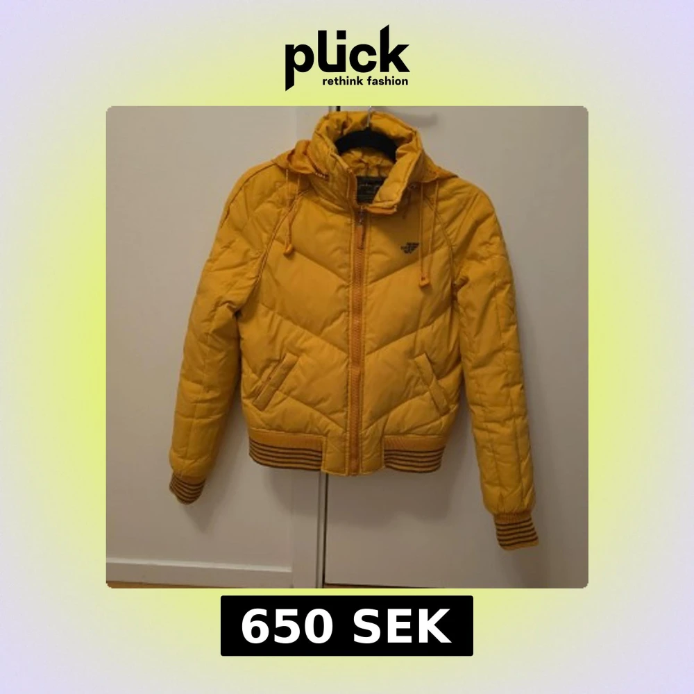 Säljer en snygg gul dunjacka med huva och dragkedja. Jackan har långa ärmar och ribbade muddar vid ärmslut och nederkant. Perfekt för kyliga dagar!