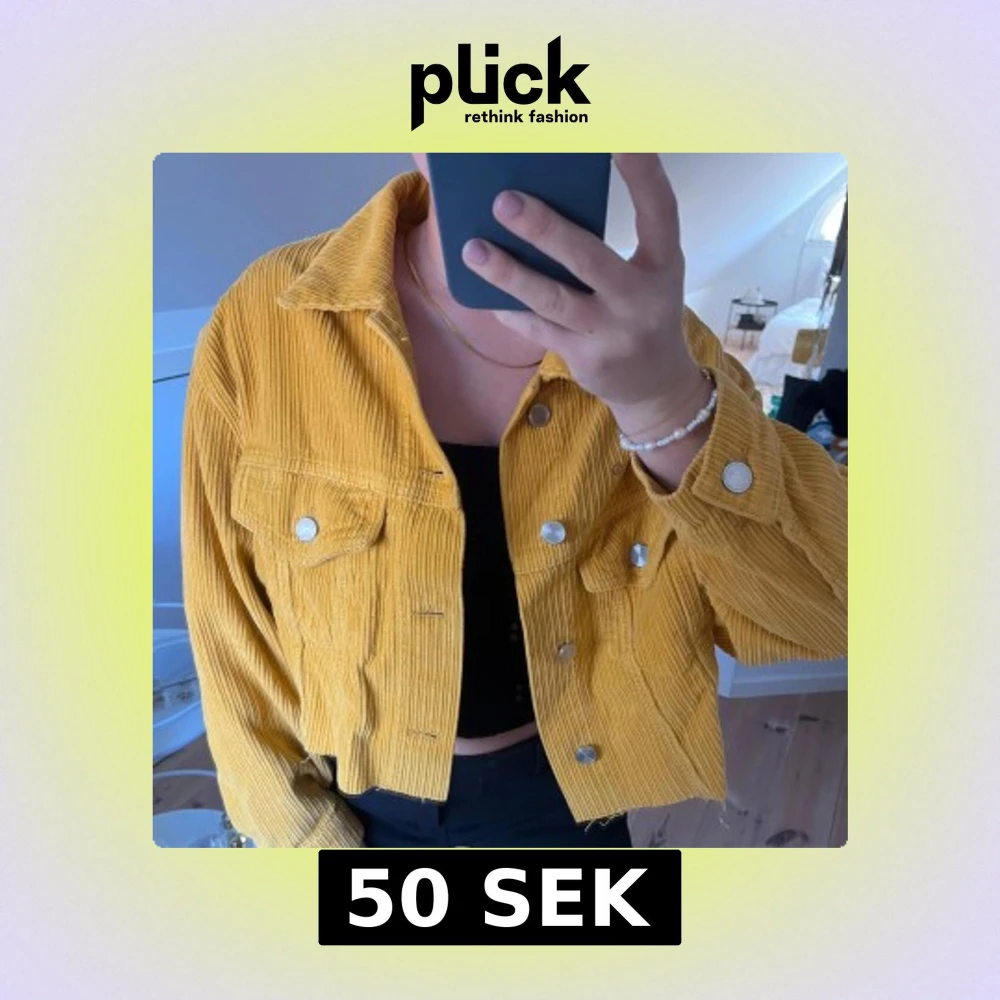 Snygg gul manchesterjacka från Karve med knappar framtill och två bröstfickor. Jackan är croppad och lite oversized! Storlek S