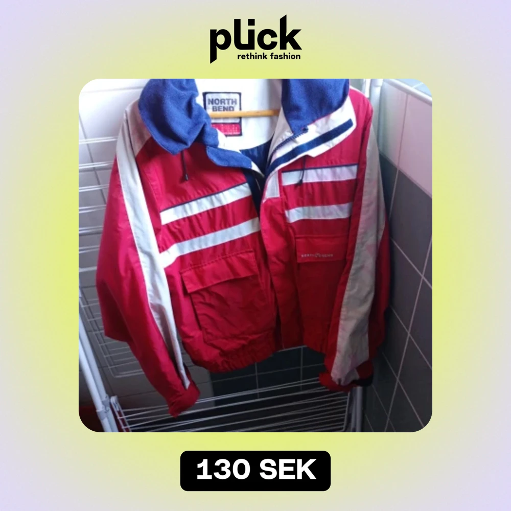 En röd och vit vindjacka från North Bend med dragkedja och fickor. Jackan har en blå insida och en gul huva. Den har långa ärmar och är lämplig för vår- och höstsäsonger.
