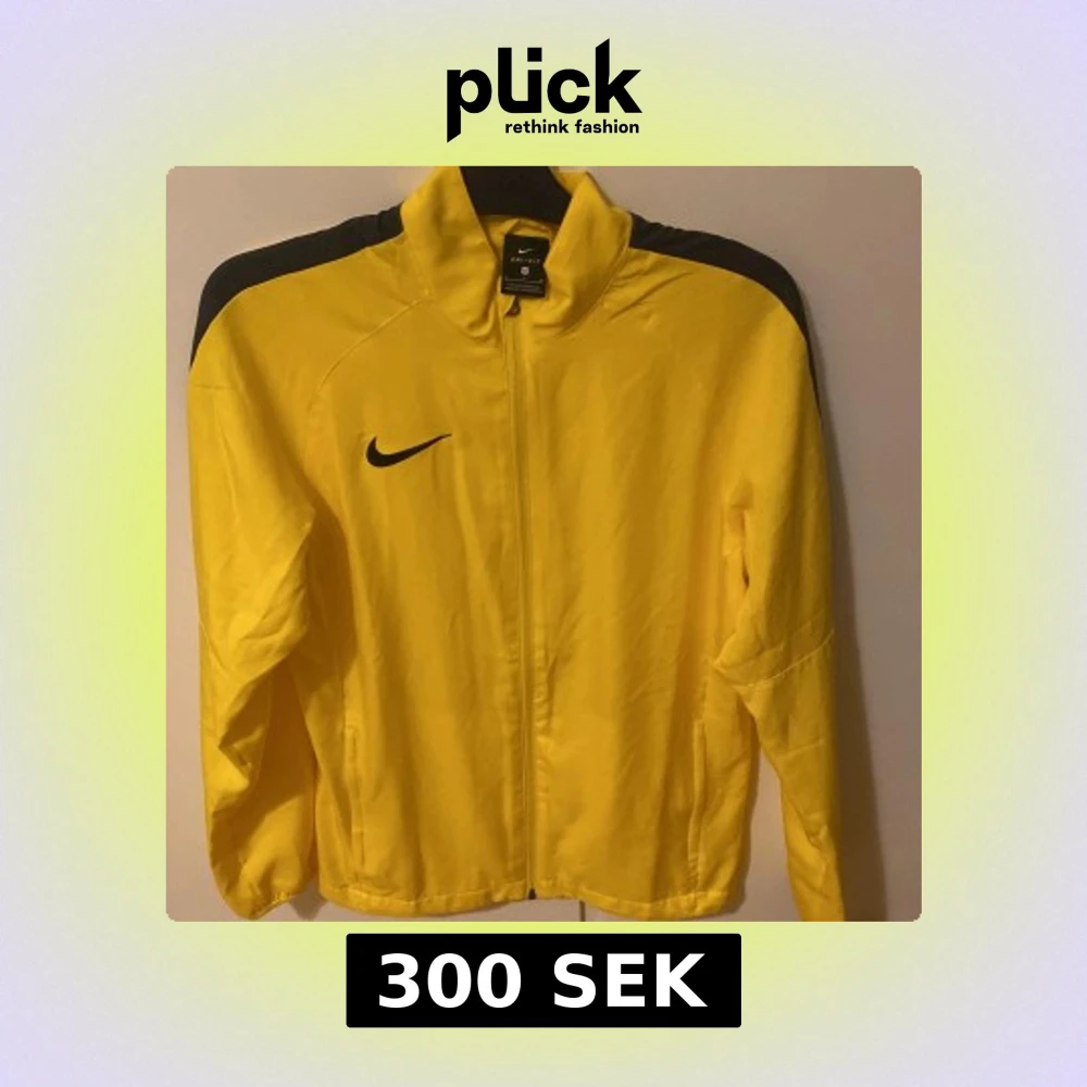 Säljer en gul träningsjacka från Nike med Dri-Fit-teknologi. Jackan har en dragkedja framtill och svarta detaljer på axlarna samt en svart Nike-logga på bröstet. Perfekt för sport och träning. Även helt ny