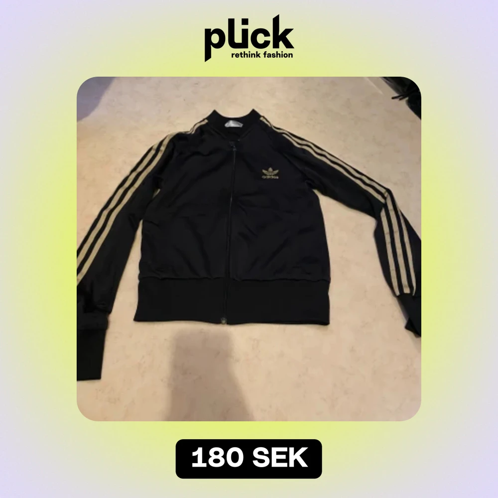 Säljer en snygg svart träningsjacka från Adidas med de klassiska tre ränderna i guld längs ärmarna. Jackan har en dragkedja framtill och Adidas-loggan på bröstet. Perfekt för både träning och vardag!