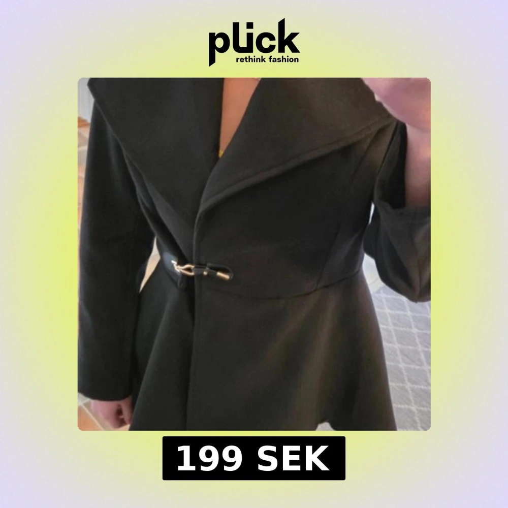 Svart, elegant jacka i medel-tjockt material, perfekt för höst och vår. Denna kappa kombinerar en figurnära, insvängd midja med en utställd nederdel (peplum/skirted-stil), vilket ger en vacker och feminin silhuett. Den har en dramatisk, stor sjalkrage som kan draperas för extra värme och stil.