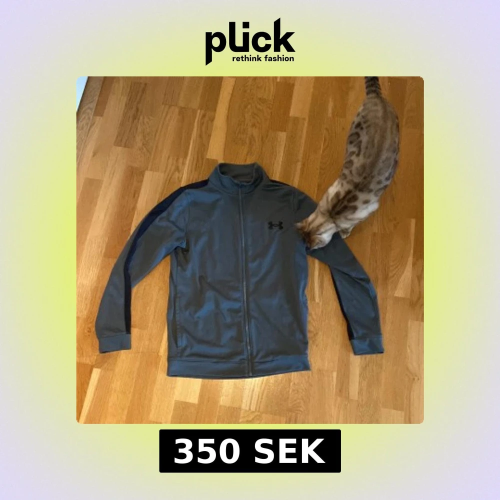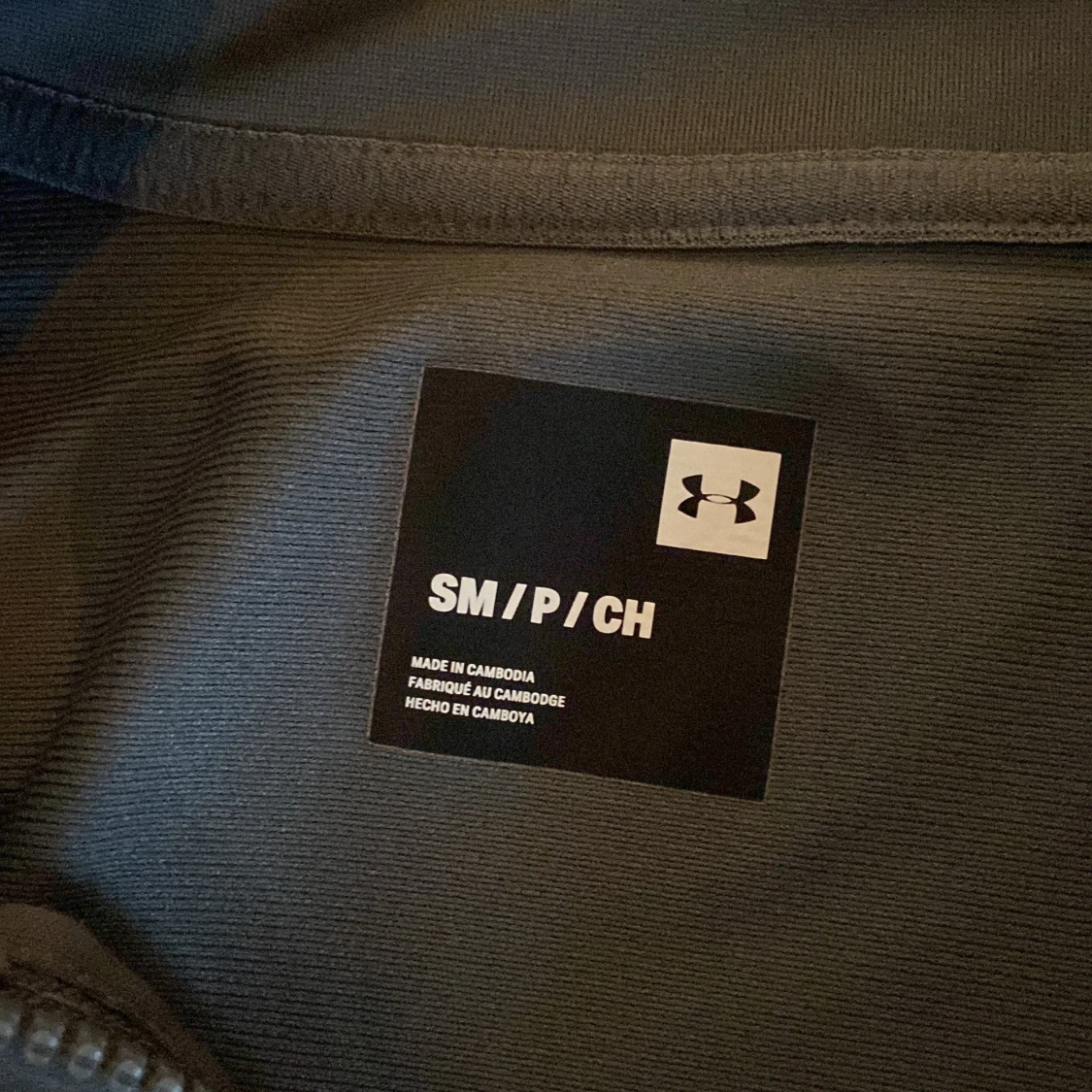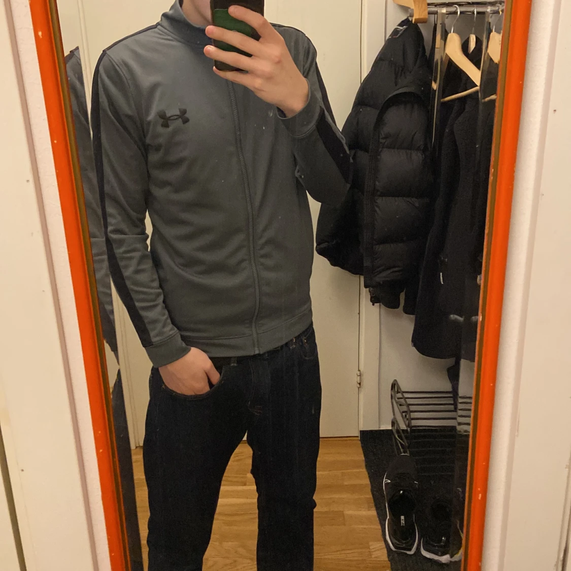 Säljer en grå träningsjacka från Under Armour med dragkedja och långa ärmar. Jackan har en stilren design med mörkare detaljer längs ärmarna och logotypen på bröstet. Perfekt för träning eller en aktiv vardag.