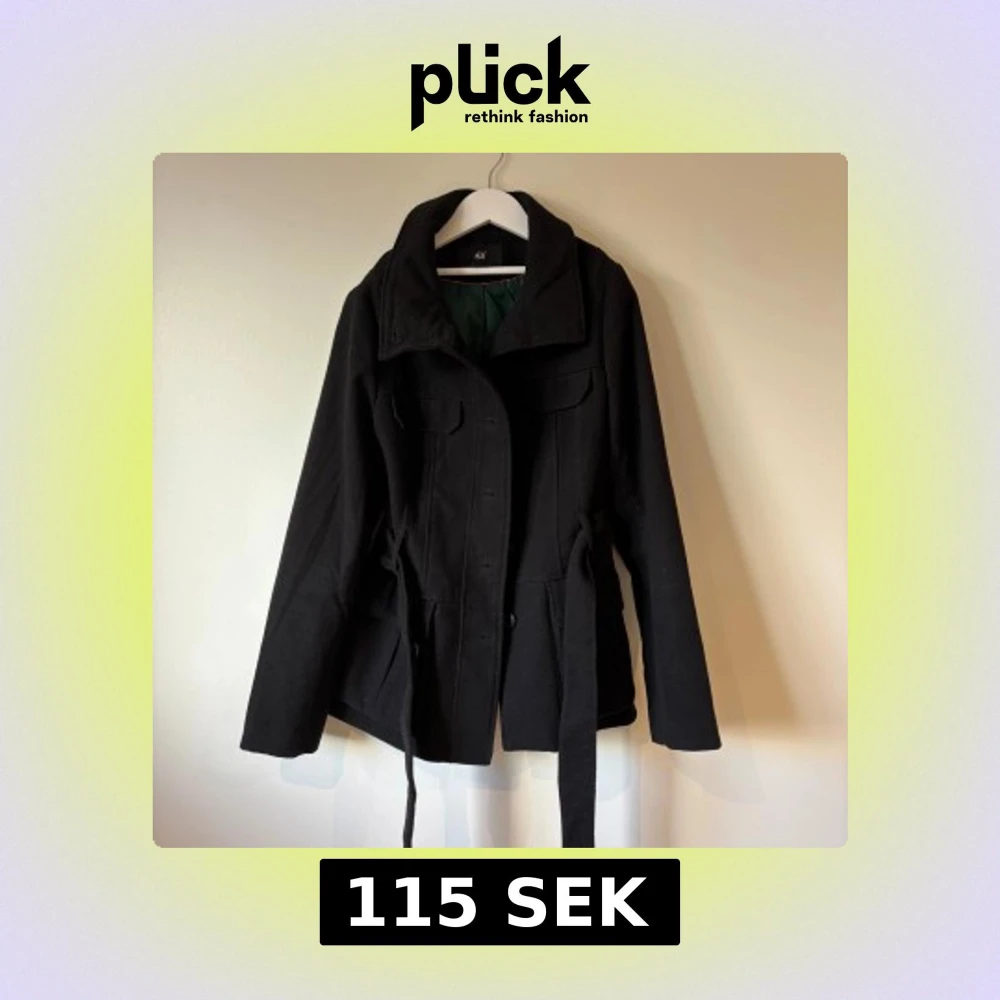 Stilren svart kappa från H&M med bälte i midjan och knappar framtill. Jackan har klassisk krage, fickor med lock och grön insida.