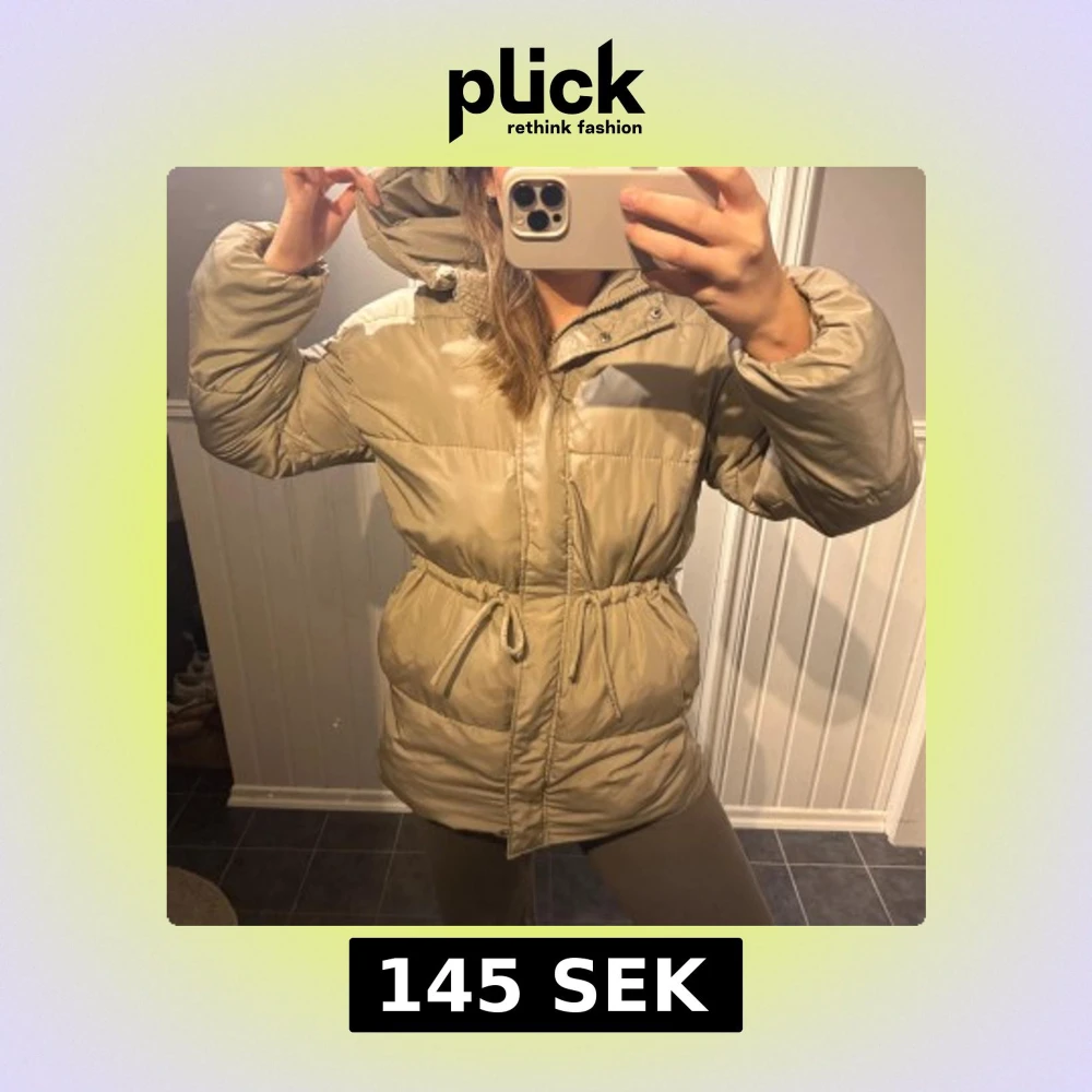 Säljer en beige pufferjacka med huva och snörning i midjan. Jackan har quiltad design, dragkedja framtill och långa ärmar. Perfekt för kalla dagar och har en loose passform som gör den extra skön att bära.