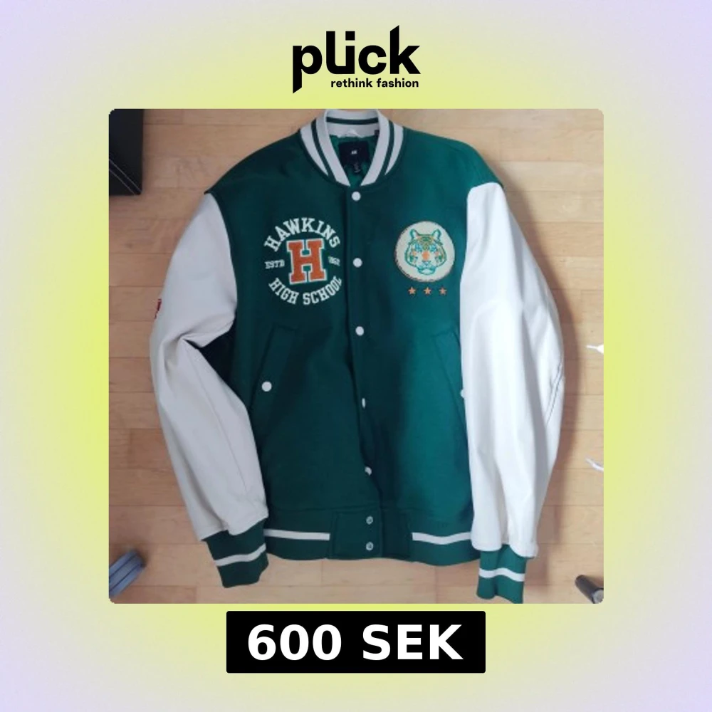 Säljer en grön och vit bomberjacka från H&M med 'Hawkins High School' och 'Stranger Things' broderat. Jackan har långa ärmar och knappar framtill. Perfekt för fans av serien! Köpt för 2 år sedan använd typ 1-2 ggr, helt perfekt skick. Öppen mot bud