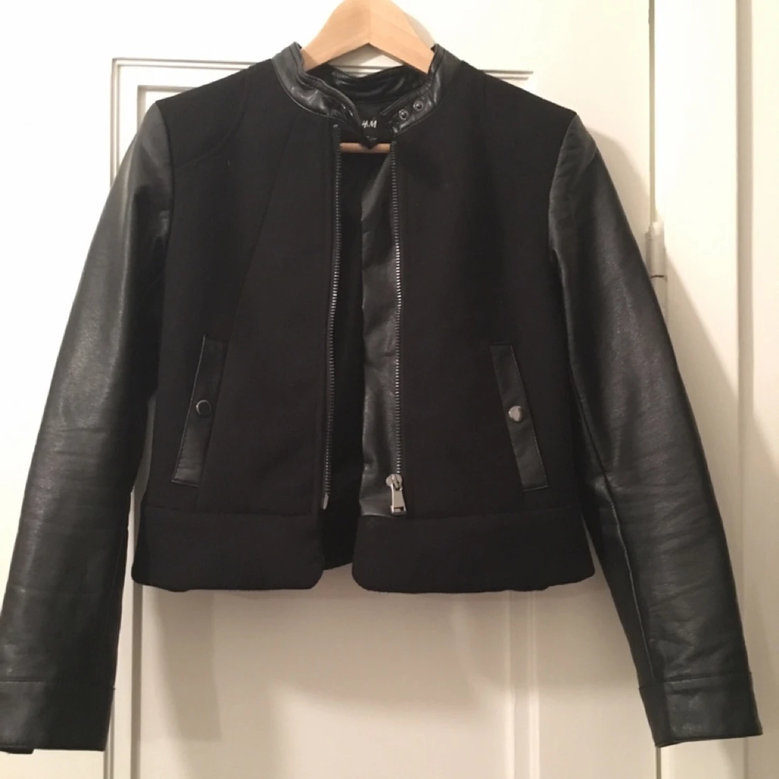 Jättefin bikerjacka i ull- och läder imitation. Knäppning med dragkedja och knappar vid halsen.