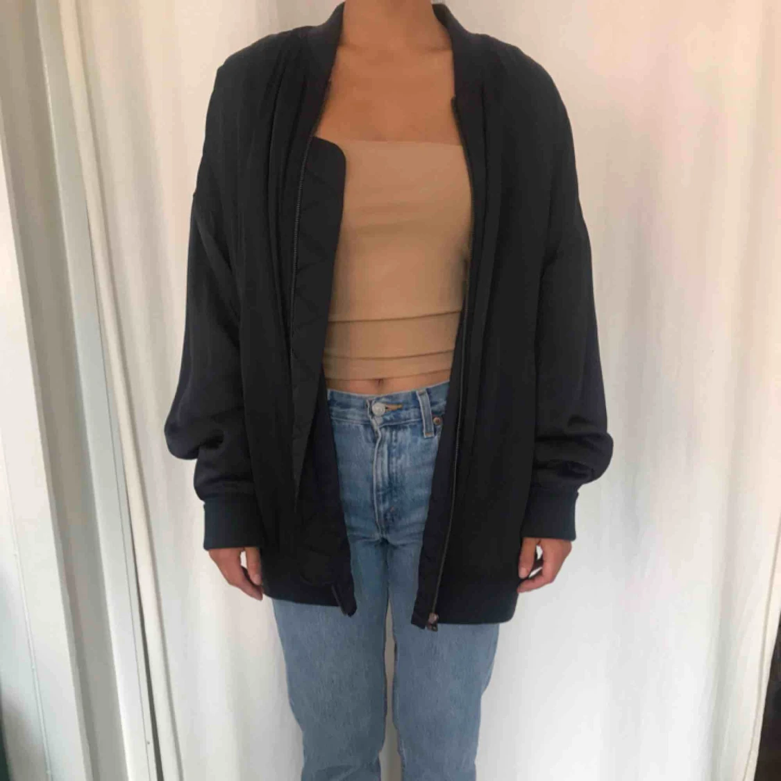 Glansig bomberjacka i mörkblå färg från H&M trend köpt för några år sen! Använd i ca 2 år men är ftf i fint skick. Kan skickas mot frakt ☺️