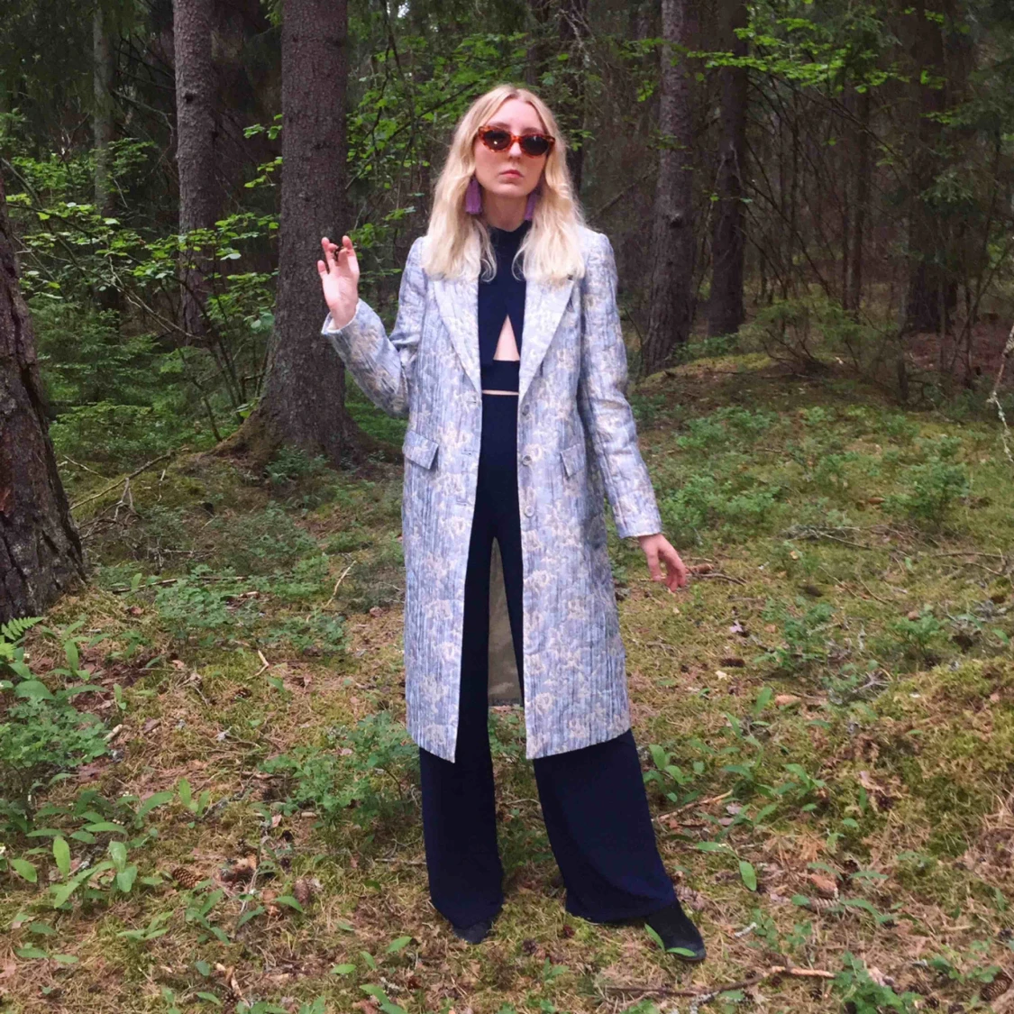 Ljusblå kappa i brokad från H&M. Fint skick, använd fåtal gånger. Endast upphämtning/mötas upp i Sthlm.