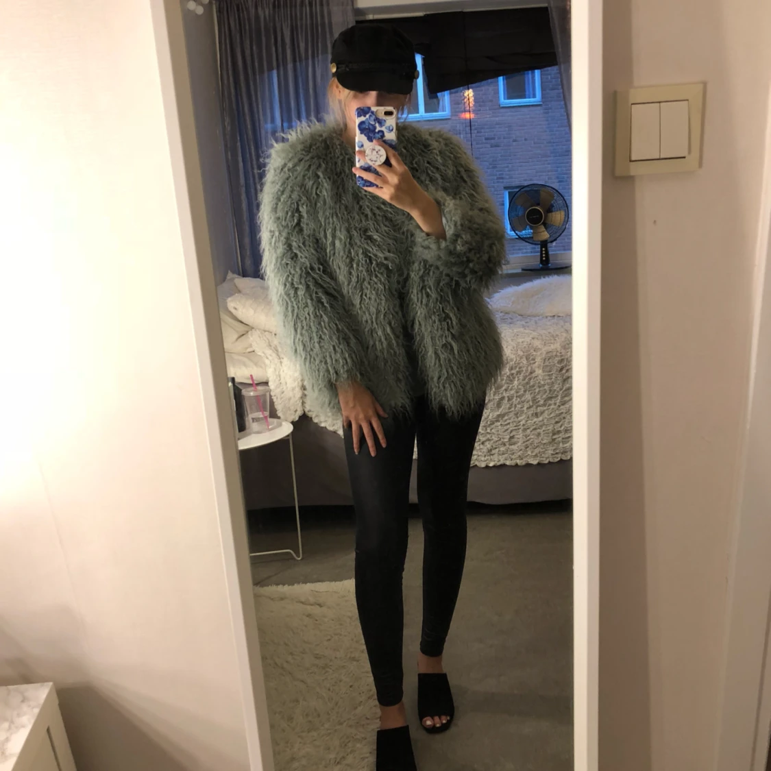 Grön fakepäls som knappt är använd. Väldigt skön och varm. Fakepälsen liknar ull.