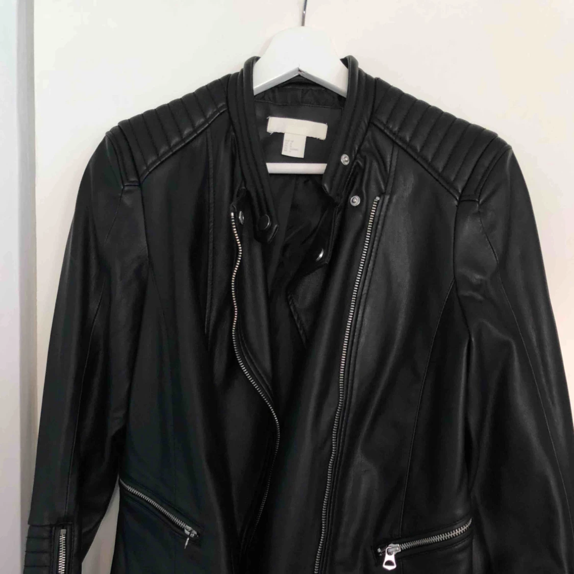 Fejk skinnjacka från HM storlek 38, passar bra på en 36a också! Använd en gång, säljer endast för att jag har för många jackor.