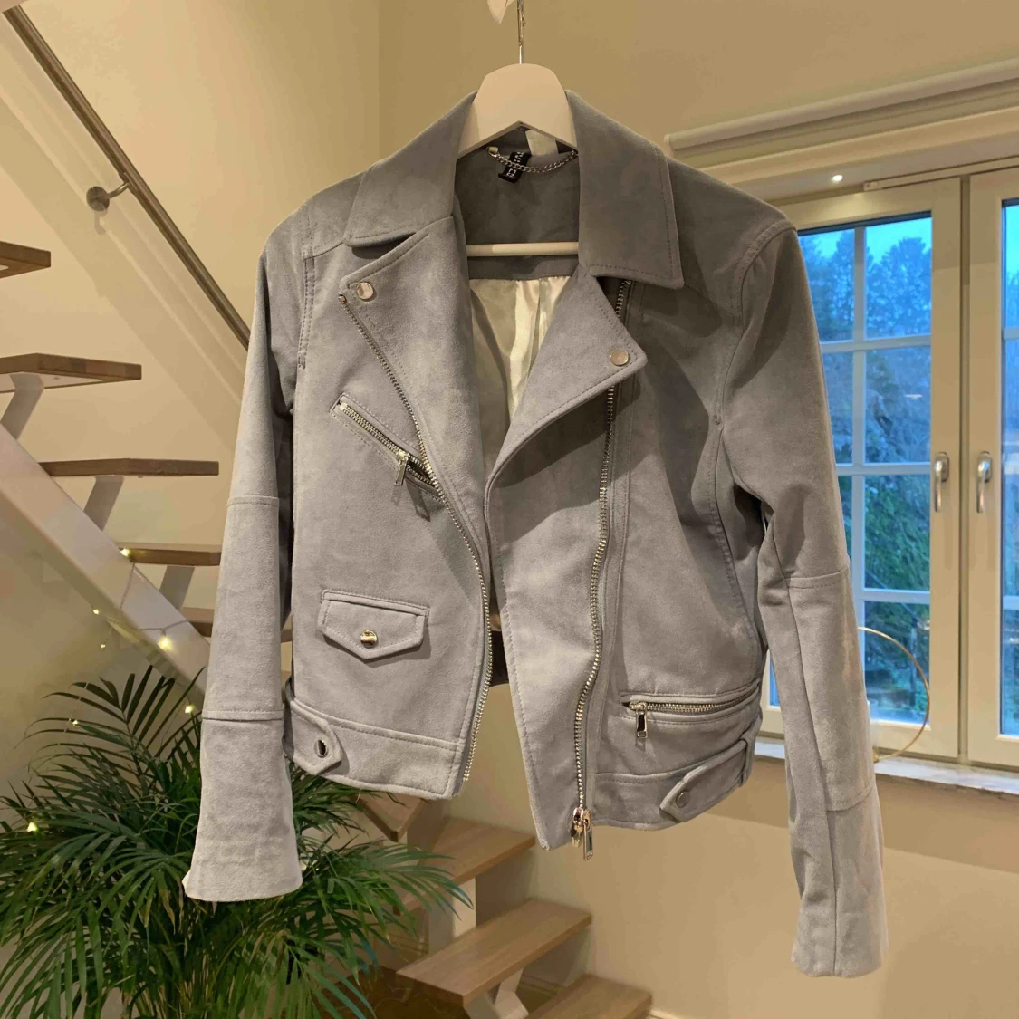 Ljusgrå/blå (mer åt det grå hållet) jacka med mockaimitation. Är i jättefint skick, aldrig använd. Går att ha både inomhus och utomhus. Den är ganska kort, går inte över rumpan. Frakten är inkluderad i priset.