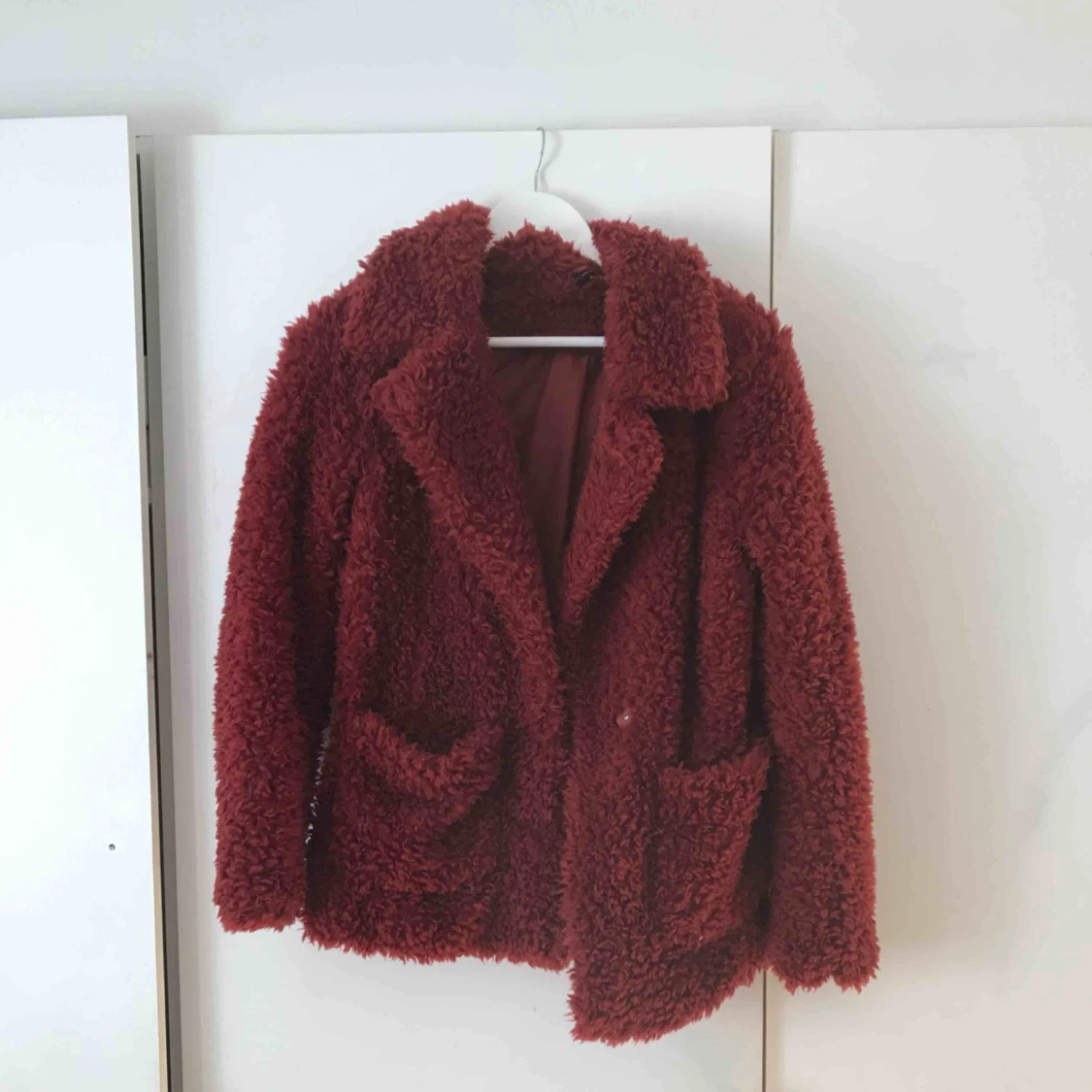 En mörkröd fluffig och varm jacka, säljer för den inte kommit till användning! Hör av er till mig om ni är intresserade!🤗 Köparen står för frakten!