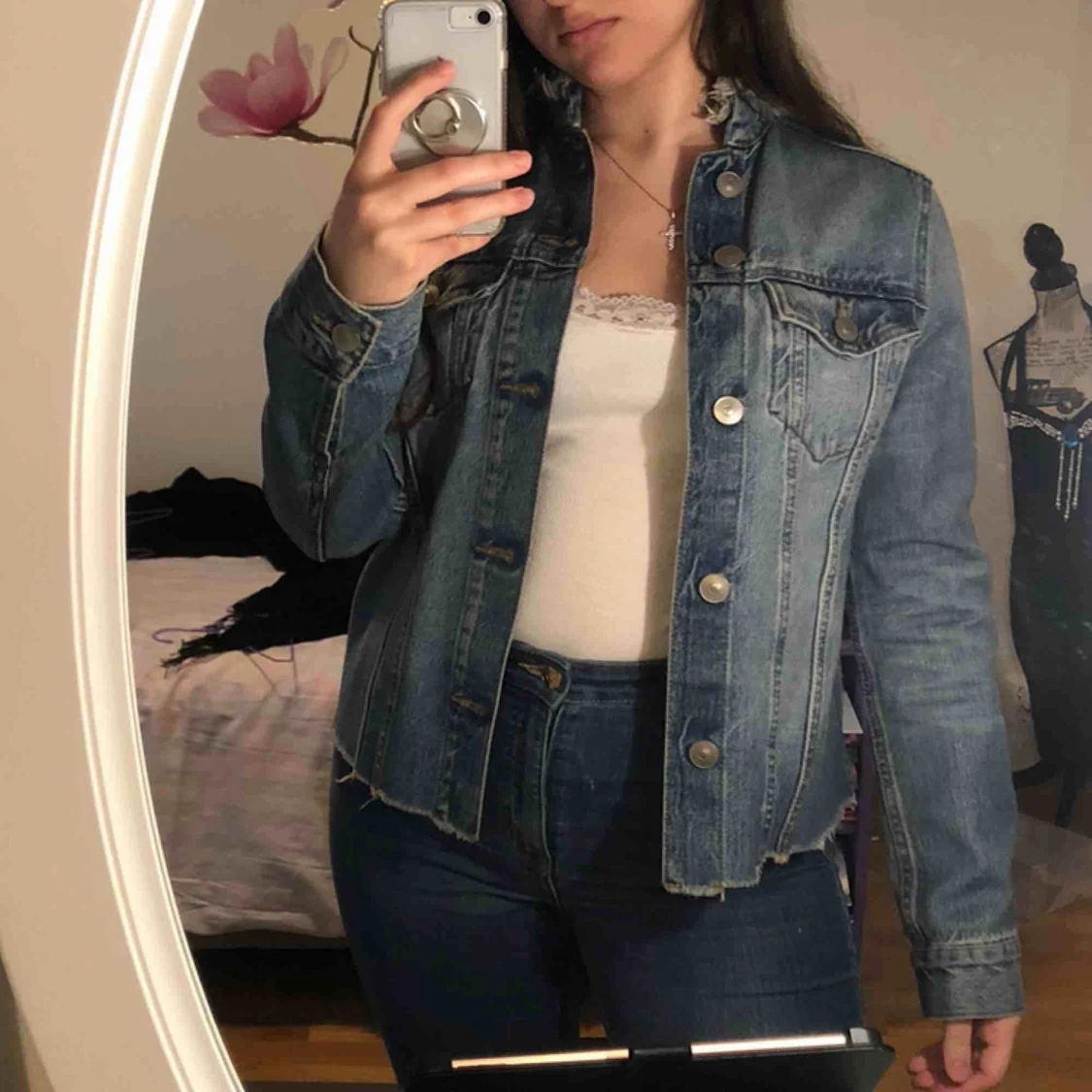 Jeansjacka från H&M som går i lite ombrefärg i ljusblått. Jackan är i storlek 36 och är använd någon gång. Köparen står för frakt eller så kan man komma hämta plagget <3