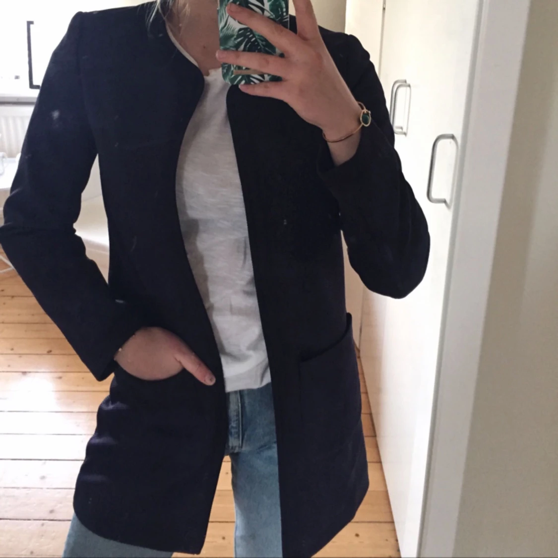 Mörkblå öppen kappa med två fickor framtill. Storlek 36 och går till halva låret på mig som är ca 170. En söm är dragen på ett konstigt sätt (bild tre) men inget jag har lagt märke till tidigare. Kappans färg kommer fram på bild tre.