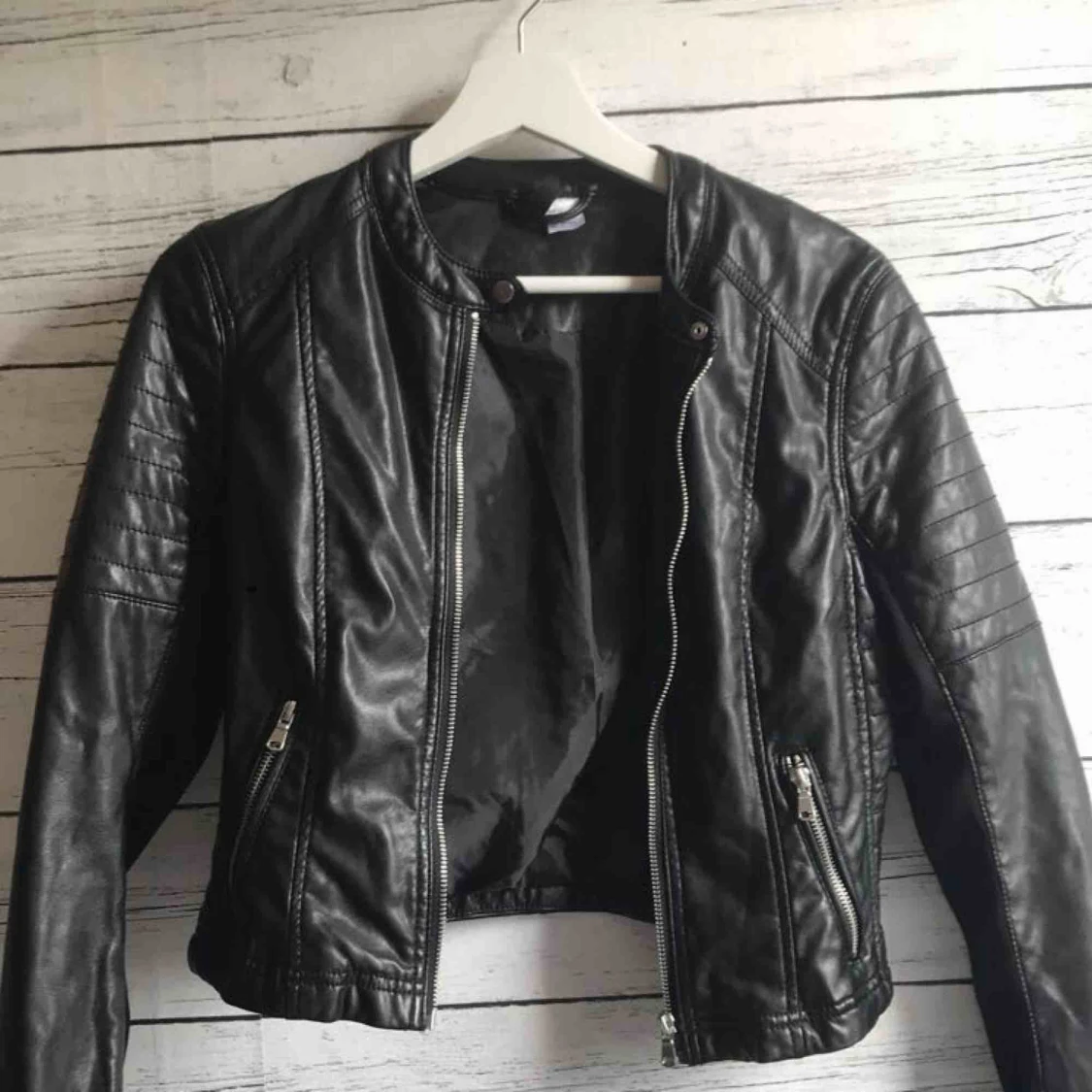 En svart skinnjacka i S men skulle säga att den passar bättre som XS! Har en skön stretch vid armarna så den blir inte för tajt och plagget andas även bra så man blir inte för varm. Har använts max 5 gånger, köparen står för frakt 25kr😊