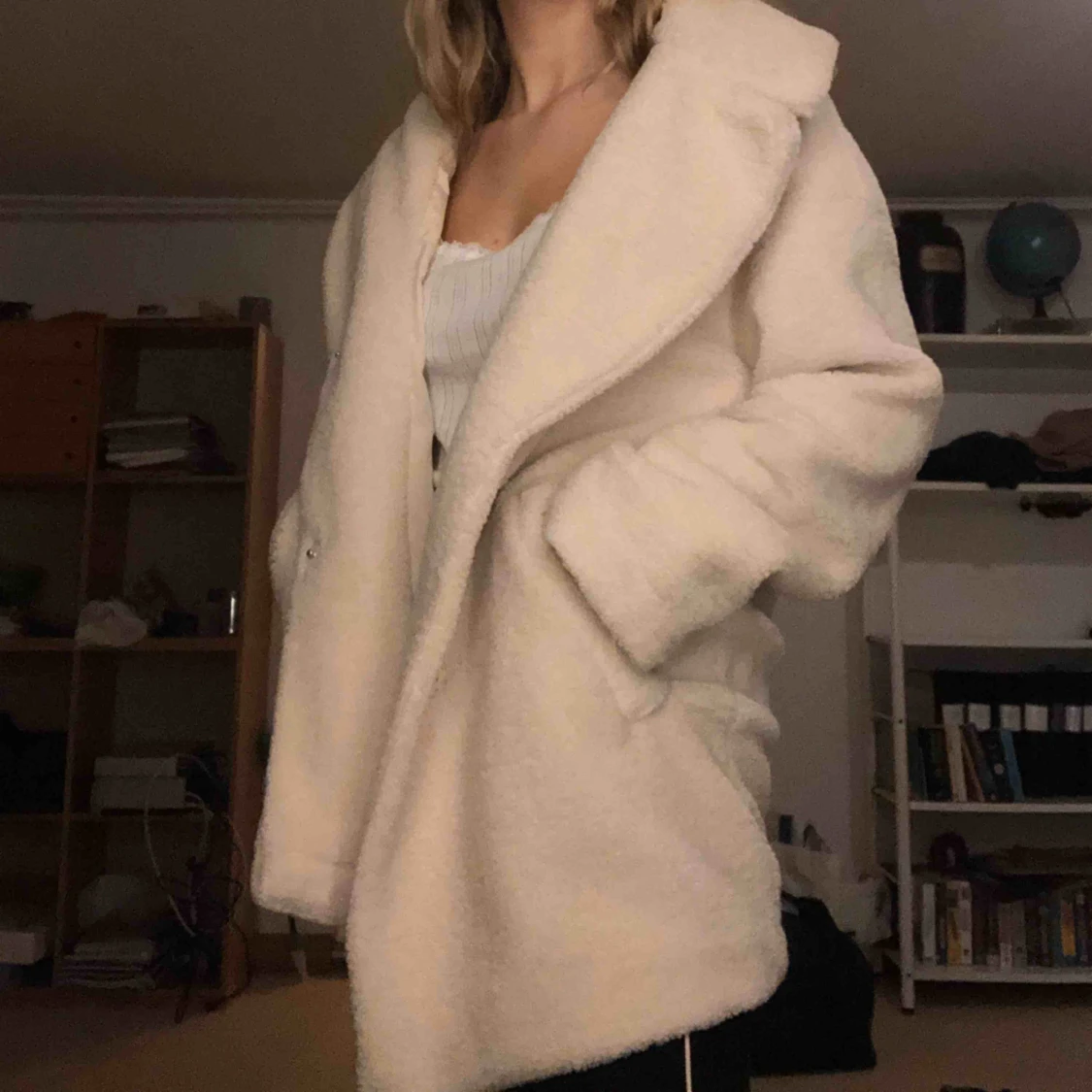 Så mysig vit lurvig jacka\kappa. Perfekt till både vinter och vår, den är lite större i storleken så man får plats med någonting under om man vill.