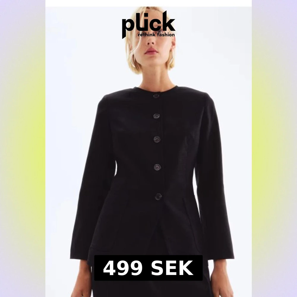 Svart figurnära kavaj i vävd viskos- linblandning. Storlek XXS, ny med prislapp från H&M. Nypris 549kr. Tunna axelvaddar, fickor och slits vid ärmslut.