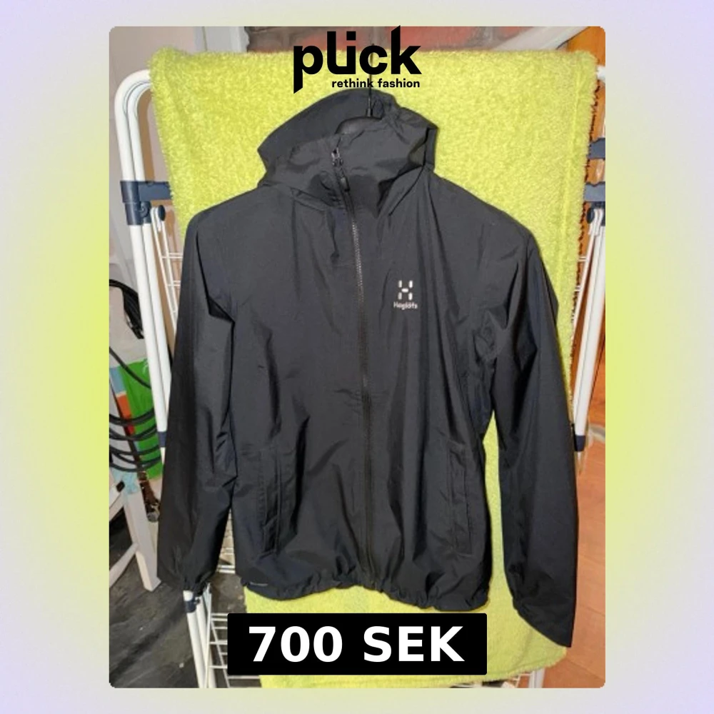 Svart vindjacka från Haglöfs i storlek M. Jackan har huva, hel dragkedja framtill och två sidofickor med dragkedja. Materialet är lätt och syntetiskt, perfekt för blåsiga dagar. meshfoder på insidan för extra komfort.