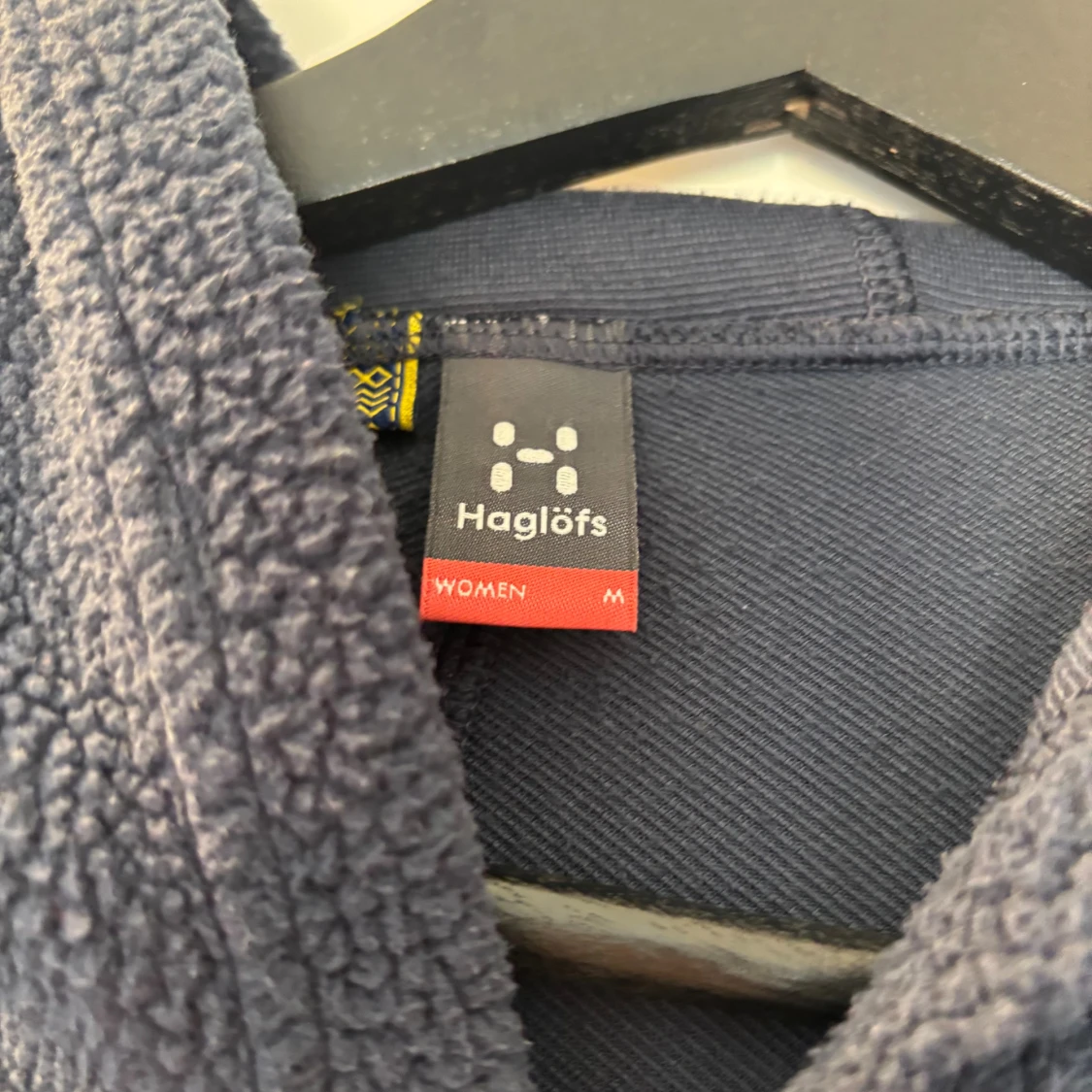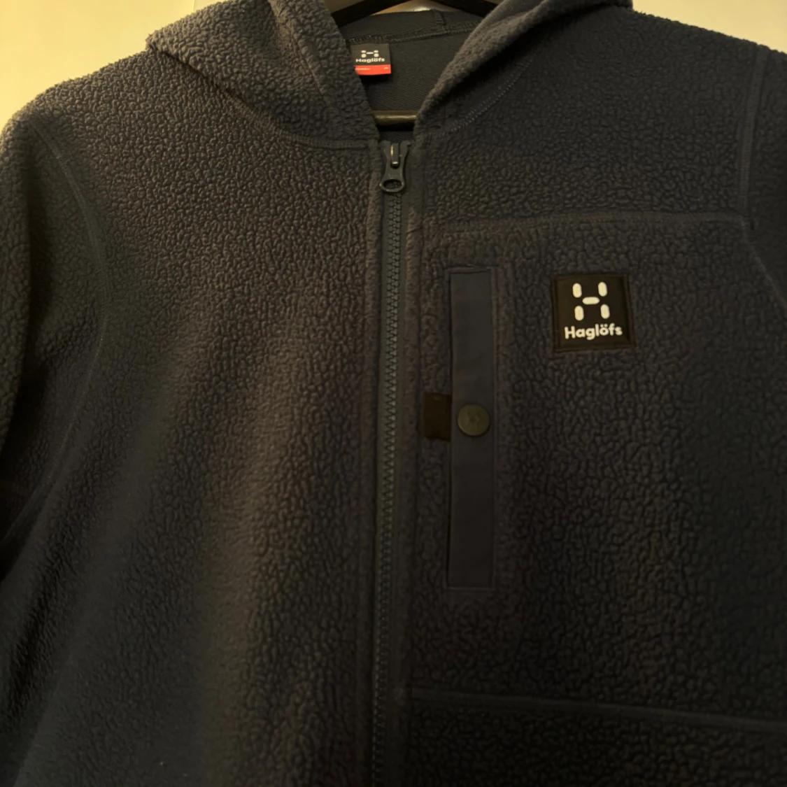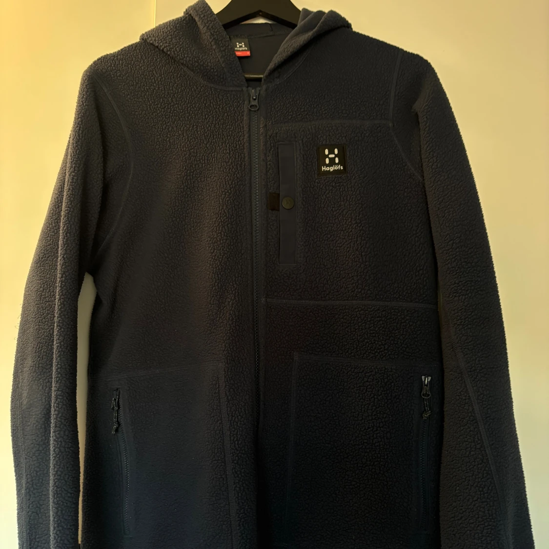 Mysig mörkblå fleecejacka från Haglöfs med huva och hel dragkedja. Jackan har två sidofickor med dragkedja och en bröstficka med knappdetalj. Perfekt för kyliga dagar och outdoor-häng.