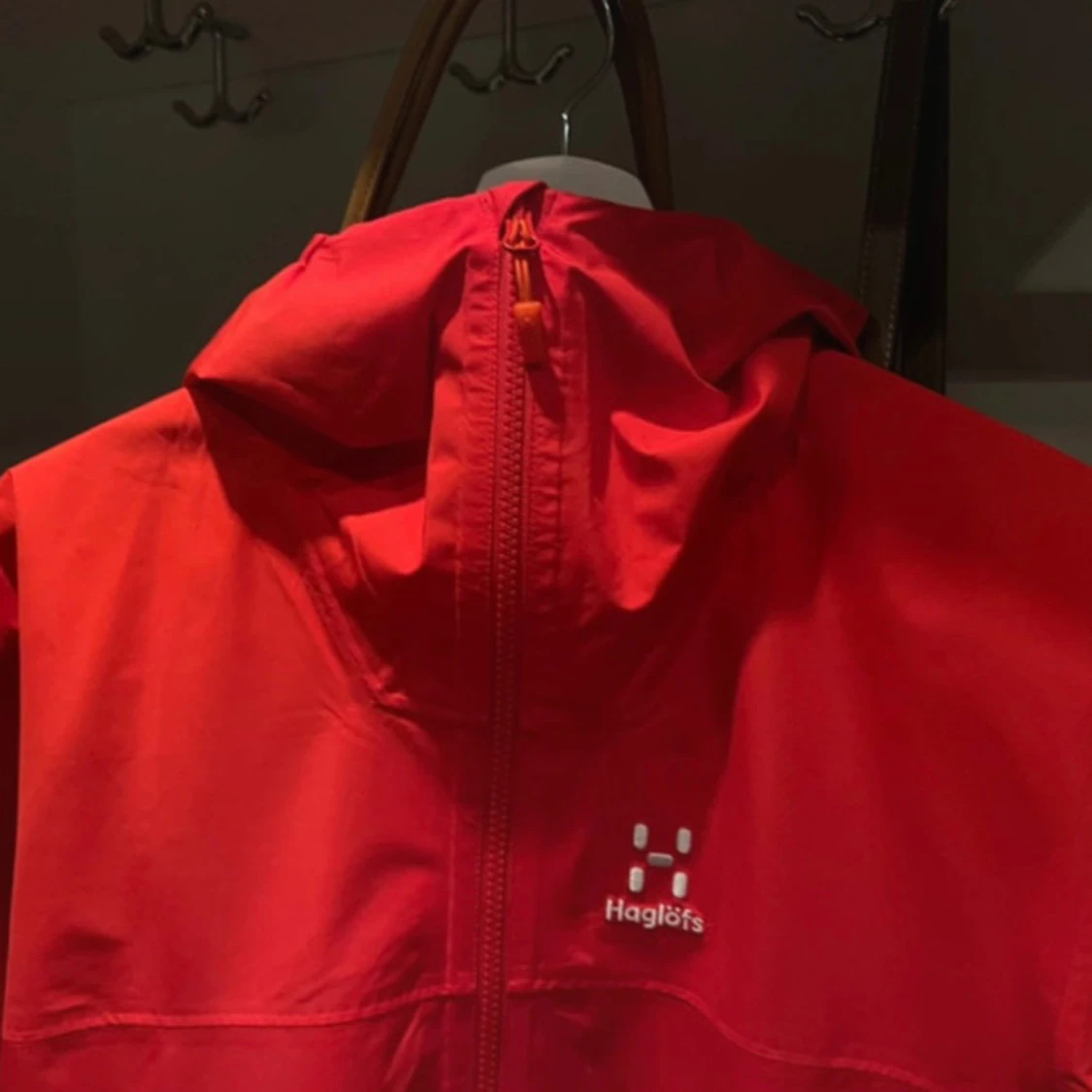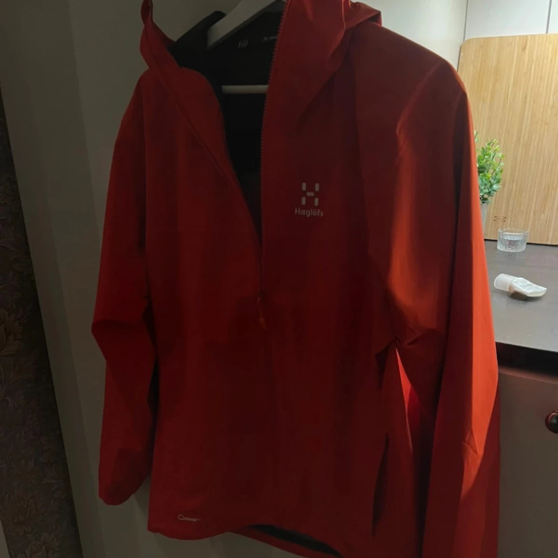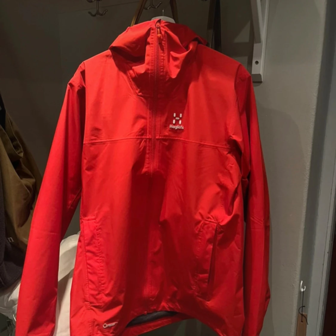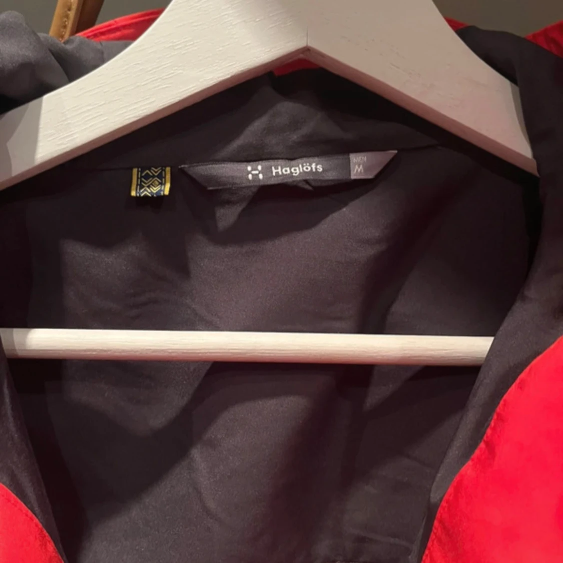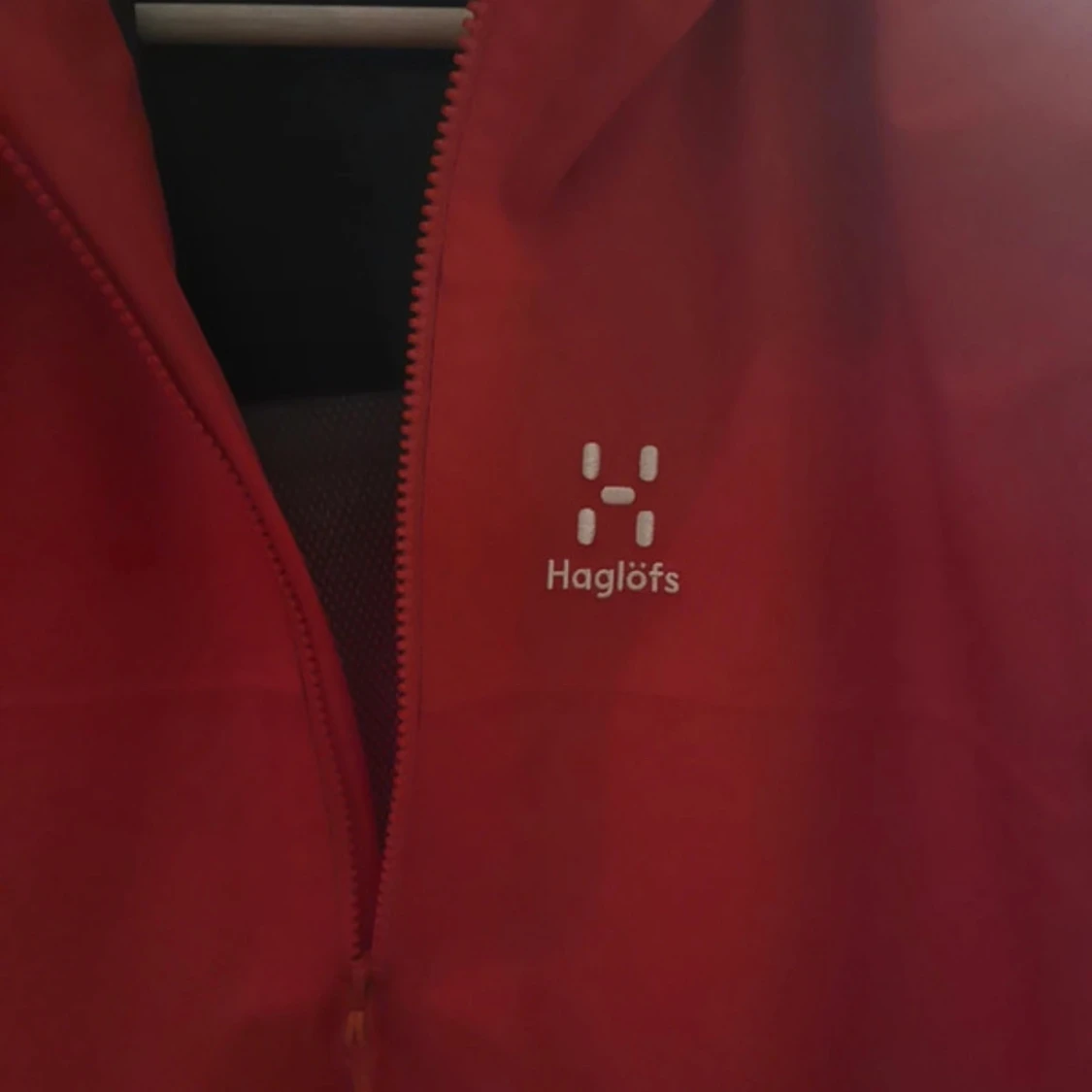 Säljer en röd vindjacka från Haglöfs i storlek M. Jackan har huva, lång ärm och en smidig half zip framtill. Materialet är lätt och syntetiskt, perfekt för utomhusaktiviteter. Snygg minimalistisk design med Haglöfs-logga på bröstet.