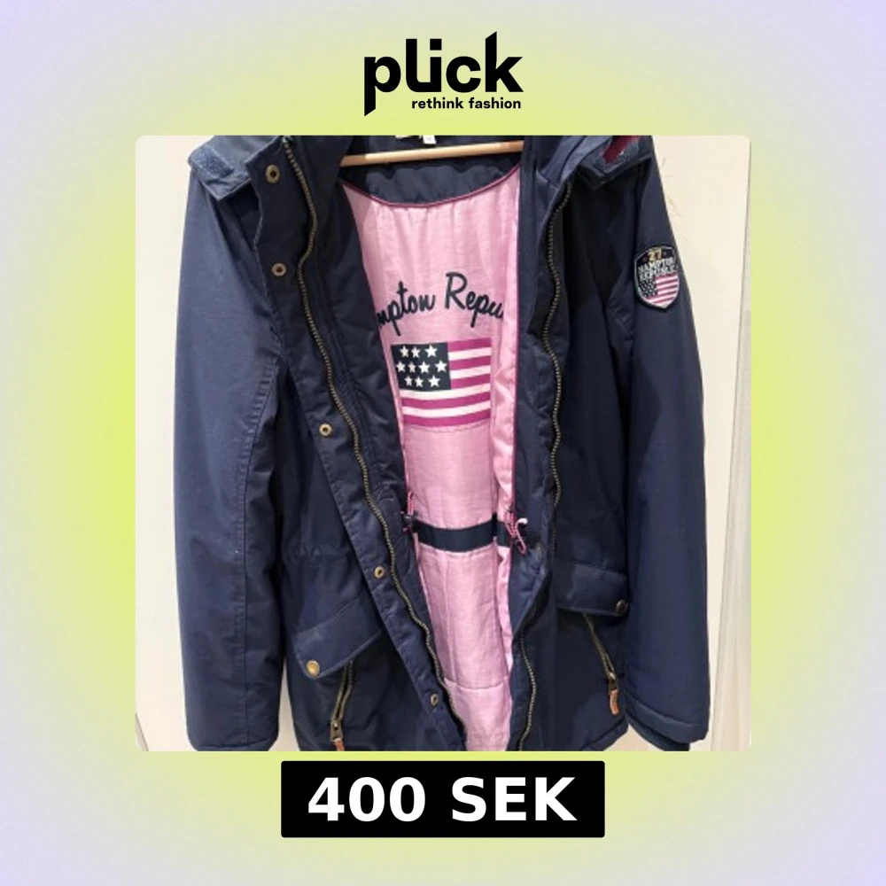 Snygg marinblå parkas från Hampton Republic med rosa foder och patch på ärmen. Jackan har huva med beige fuskpäls, dragkedja och knappar framtill samt praktiska fickor. Perfekt för kyliga dagar och har en sportig, amerikansk vibe. Storlek: 170