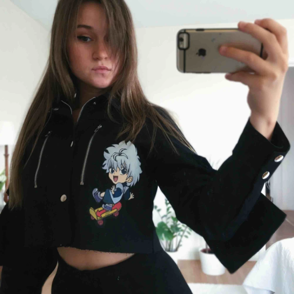 Croppad jacka med Killua från hunterxhunter. Handmålad av mig med textilfärg✨💕