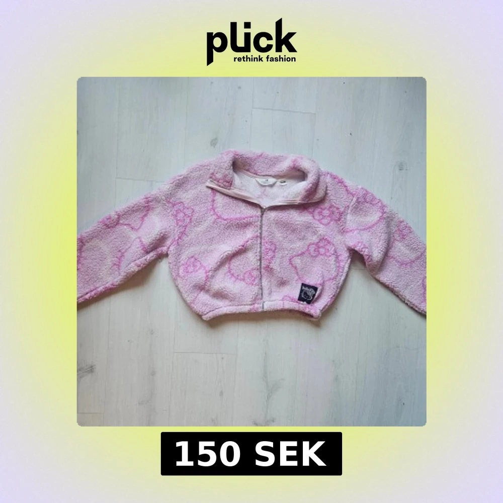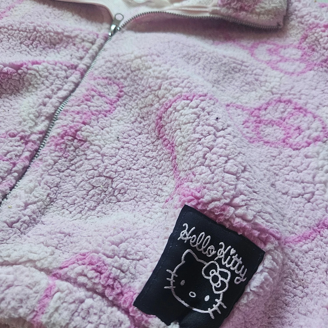 Supergullig rosa teddyjacka från H&M x Hello Kitty med broderad Hello Kitty-patch framtill. Jackan är croppad, har dragkedja och är gjord i mjuk fleece med Hello Kitty-mönster i rosa nyanser. Perfekt för dig som vill ha en mysig och söt look.