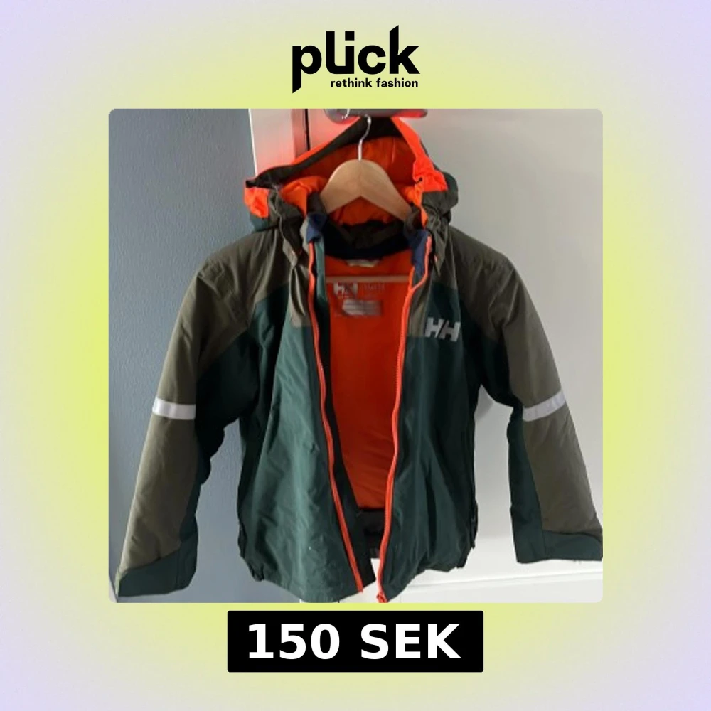 Cool grön och olivfärgad vindjacka från Helly Hansen med orange detaljer och huva. Jackan har reflekterande band på ärmarna, dragkedja framtill och logga på bröstet. Perfekt för vinterdagar och utomhusaktiviteter. Använd 2 ggr. Storlek 140. Katt finns i hemmet.