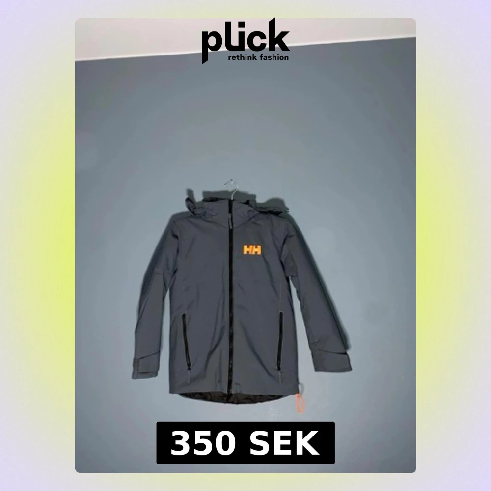 Säljer en mörkgrå vindjacka från Helly Hansen med orange HH-logga på bröstet och huvan. Jackan har huva, två dragkedjeförsedda fickor och justerbar nederkant med orange snodd. Perfekt för blåsiga dagar och outdoor.