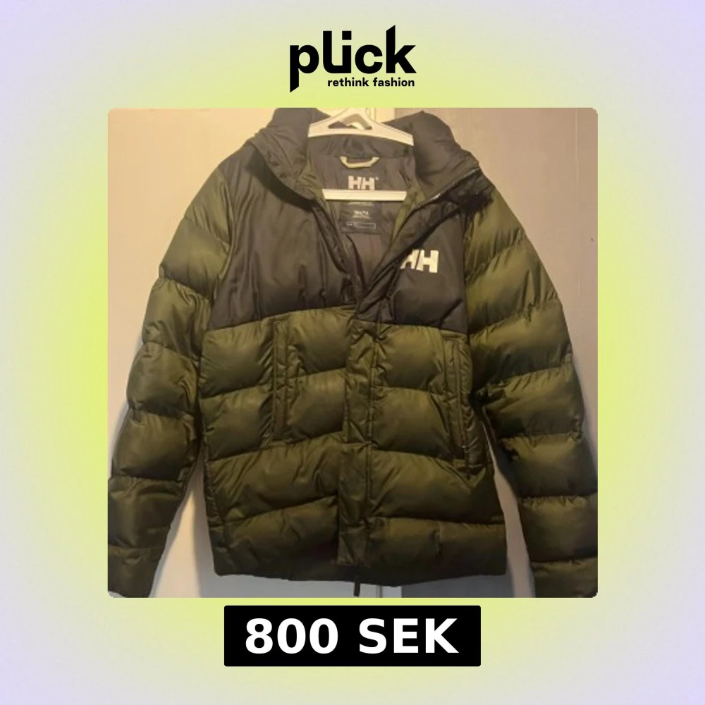 Säljer en grön och svart pufferjacka från Helly Hansen med huva och dragkedja. Jackan har stora fickor framtill och HH-logga på bröstet och ryggen. Perfekt för kalla dagar och riktigt snygg streetstil.
