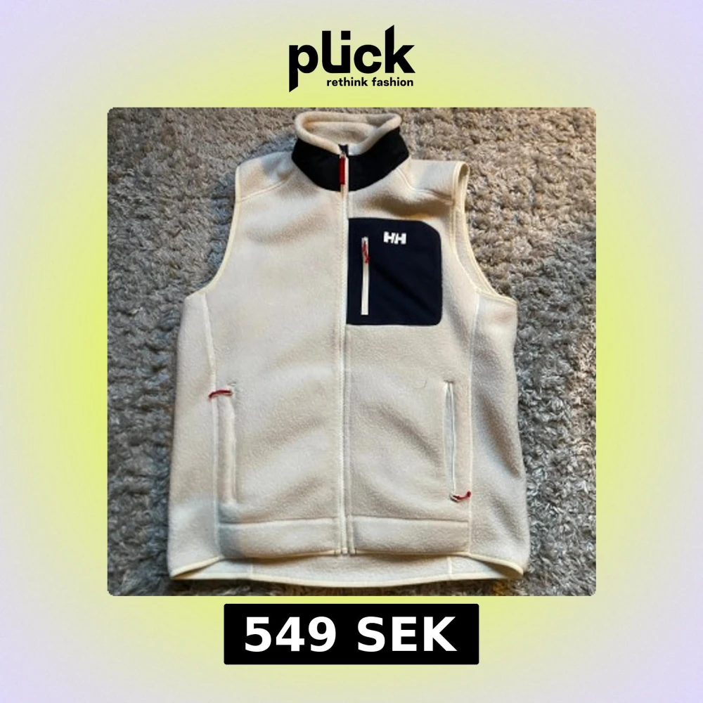 Säljer en vit fleeceväst från Helly Hansen med dragkedja och en praktisk bröstficka i marinblått. Västen har en hög krage och röda detaljer vid dragkedjorna. Perfekt för kyliga dagar! Skick: 9,5/10