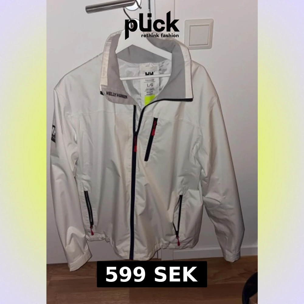 Snygg vit vindjacka från Helly Hansen med Helly Tech Protection. Jackan har svarta dragkedjor med röda detaljer, hög krage och tre fickor framtill. Perfekt för blåsiga dagar och har en clean, sportig look.