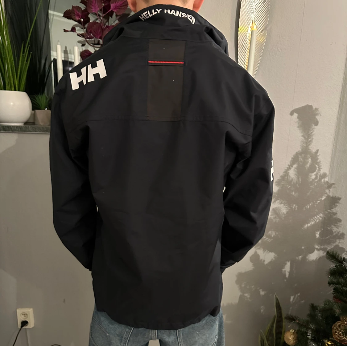 Snygg marinblå jacka från Helly Hansen med dragkedja och orange detaljer. Jackan har en hög krage och långa ärmar. Perfekt för en stilren look. Personen på bilden är 180 väger 65 kg!