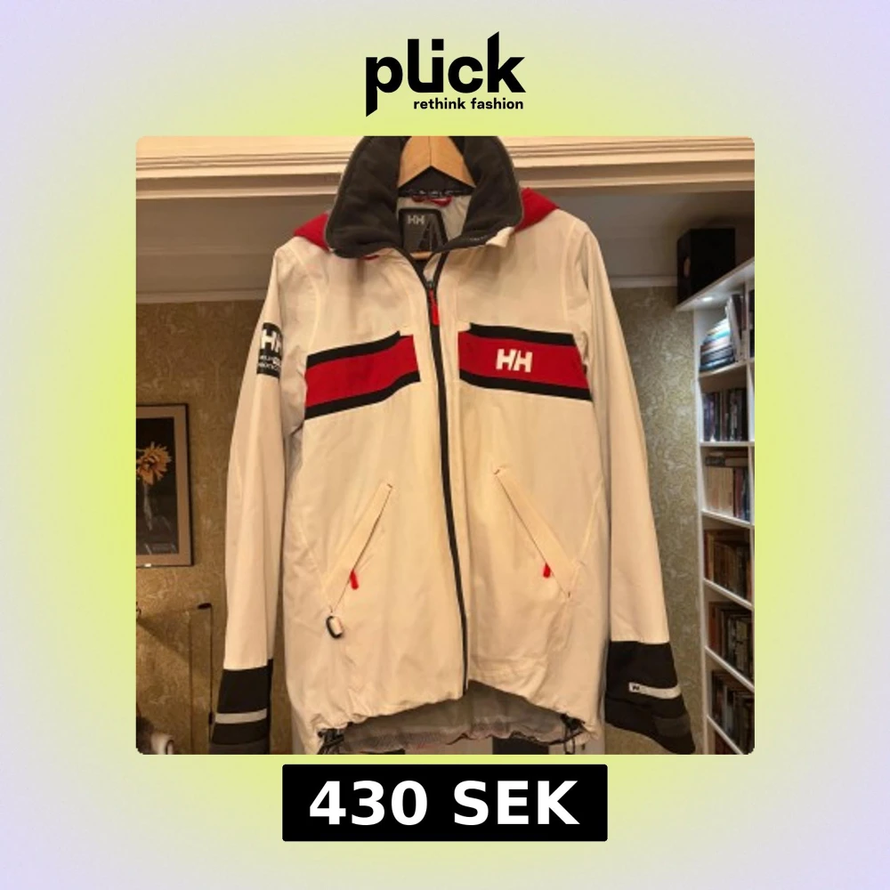 Snygg seglarjacka från Helly Hansen i vitt med röda detaljer. Jackan har hög krage med fleecefoder, dragkedja framtill, två fickor med dragkedja och justerbar nederkant. Perfekt för blåsiga dagar på stan eller en tur på sjön. Jackan är ganska liten för sin storlek. Hade passat bättre för S eller M personer.